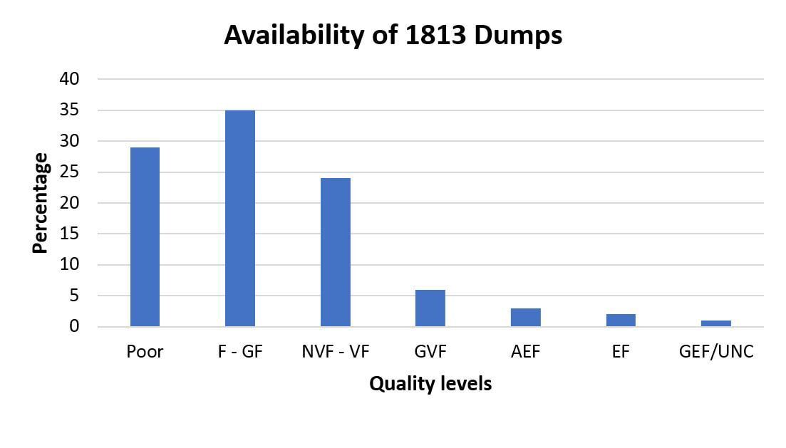 The chart below clearly shows that securing a Colonial Dump in a quality level of Good Very Fine or better is a difficult task. We would sight a Good Very Fine Dump on the open market perhaps once or twice every year.