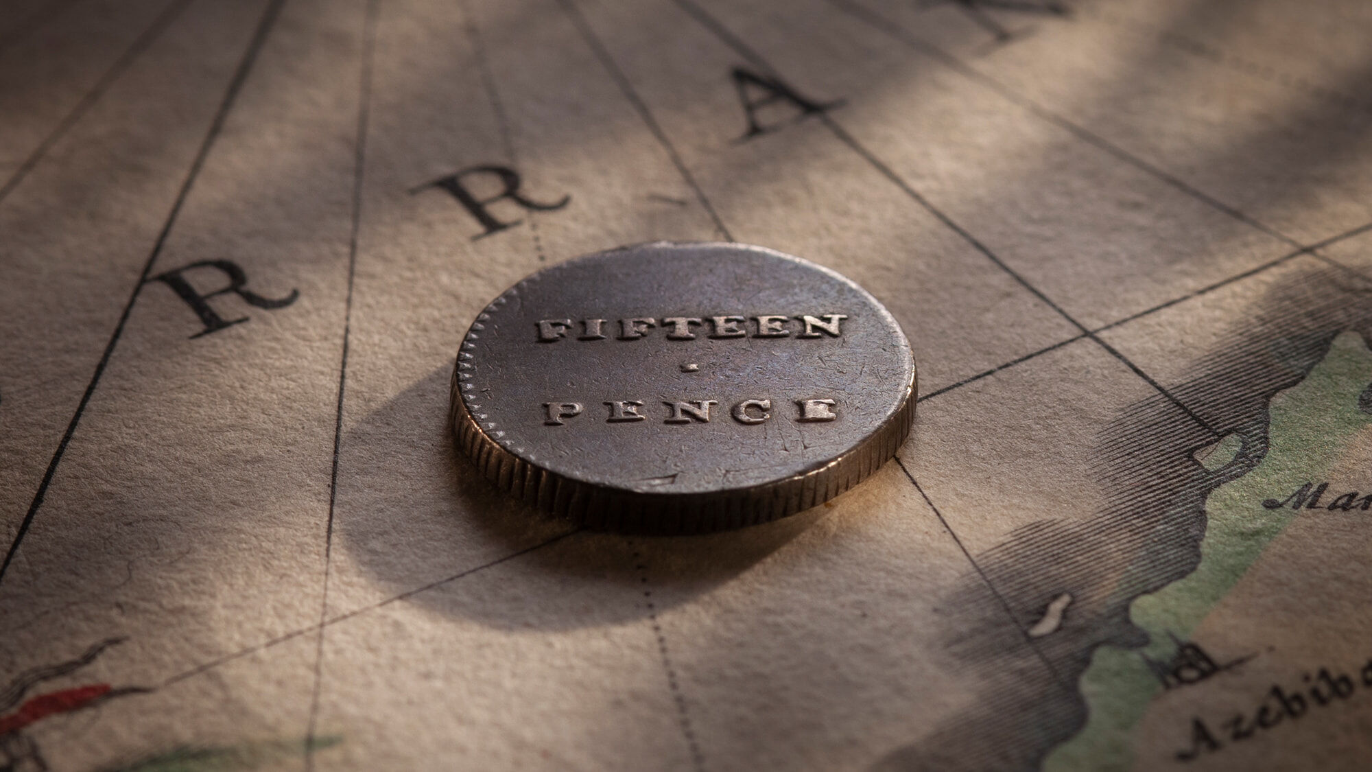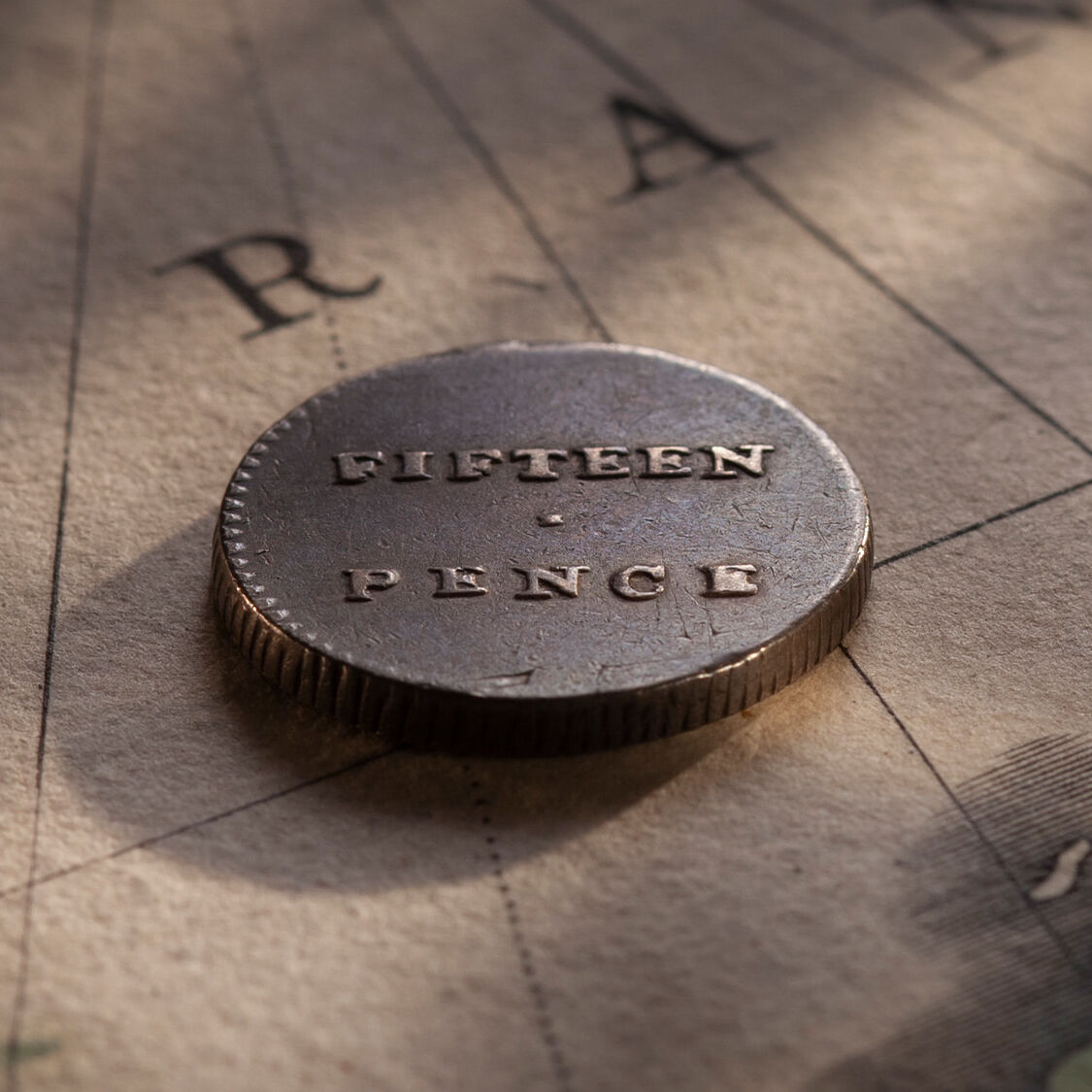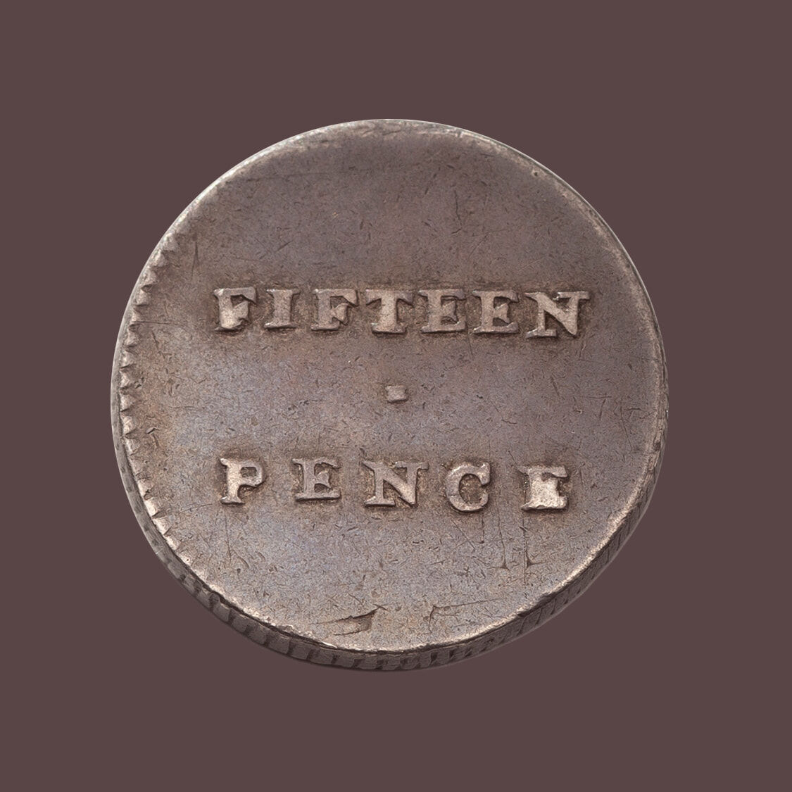 Two extremely important elements are shown on the reverse of this Dump, elements that are not always present in every example. The 'H' for Henshall between the words 'FIFTEEN' and 'PENCE'. And the design detail from the original Spanish Dollar from which it was created, shown below the word 'PENCE'.