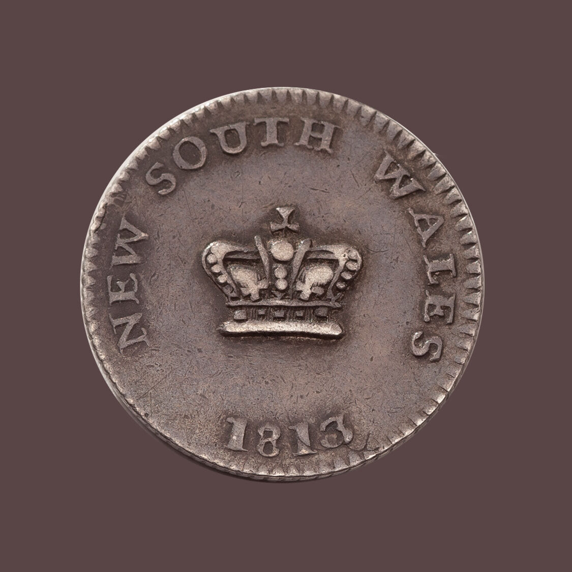 Struck with the A/1 dies, the crown is classically well-centred. The design details are chunky, strongly three-dimensional ... and by this we are referring to the crown with its fleur-de-lis and pearls, the legend New South Wales, the date 1813 and on the reverse, the value Fifteen Pence.