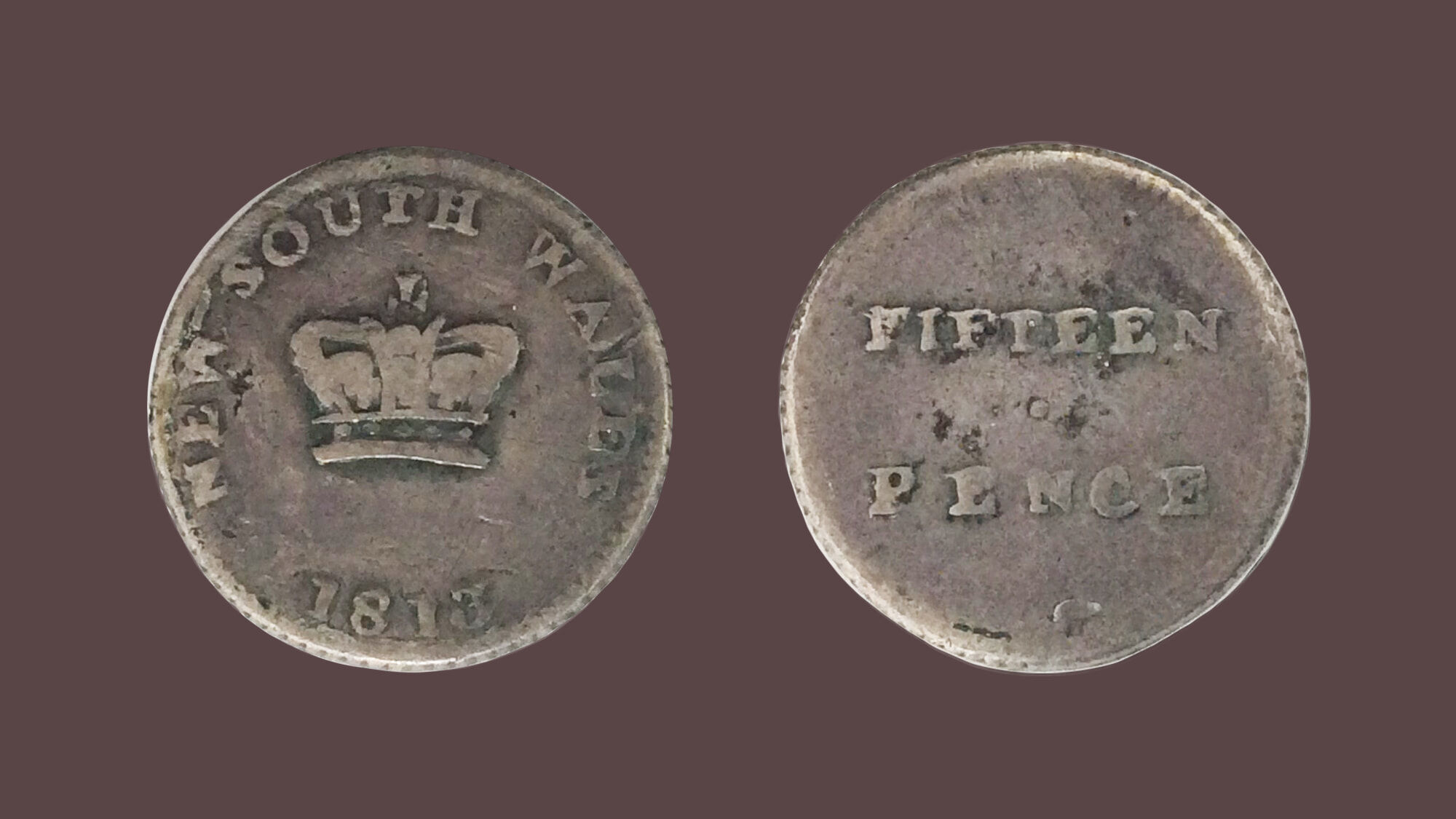 The Dump, the small disc that fell out of the centre of the holed silver dollar, was then over stamped with the date 1813, a crown, New South Wales and the value of fifteen pence.