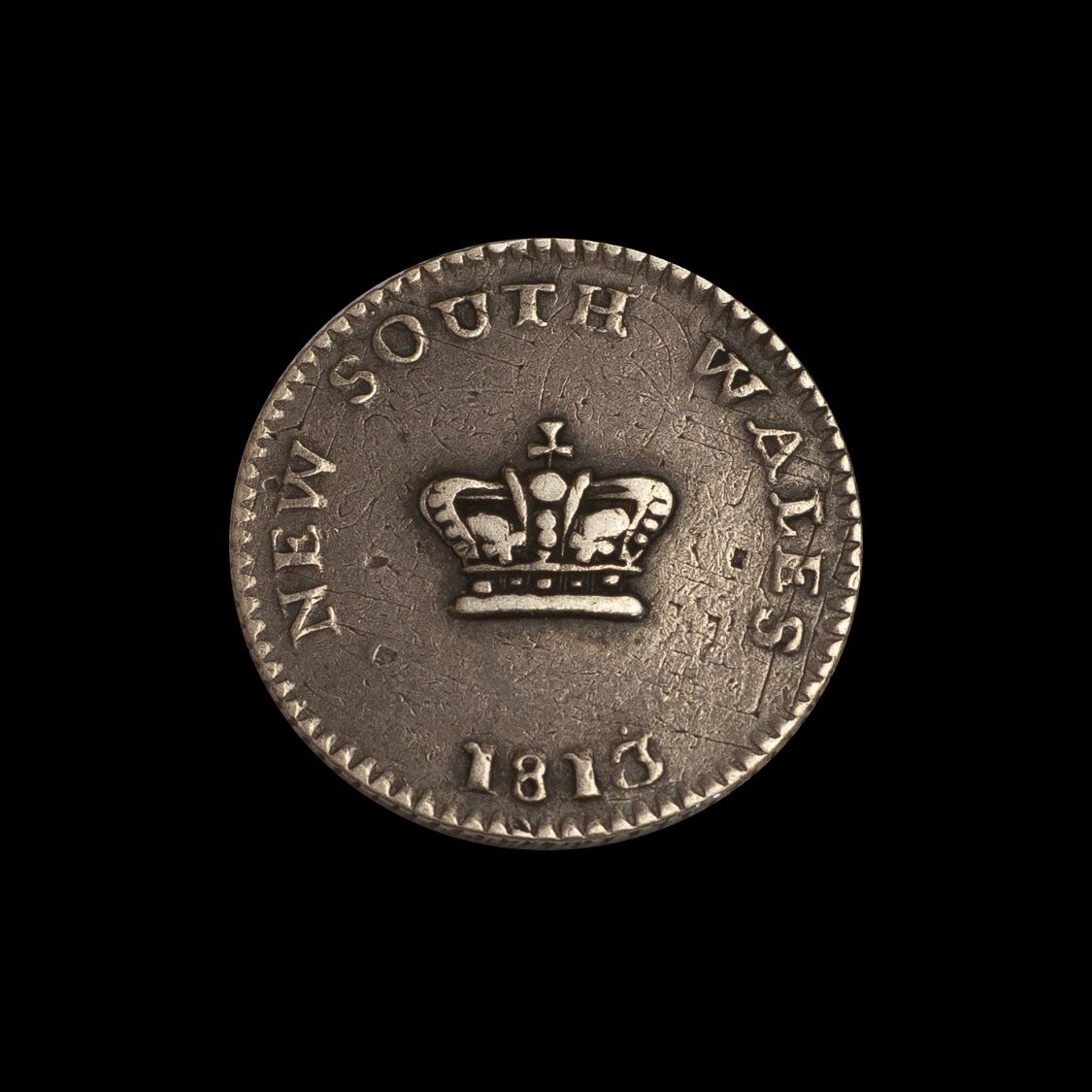 The Dump, the small disc that fell out of the centre of the holed silver dollar, was then over stamped with the date 1813, a crown, New South Wales and the value of fifteen pence.