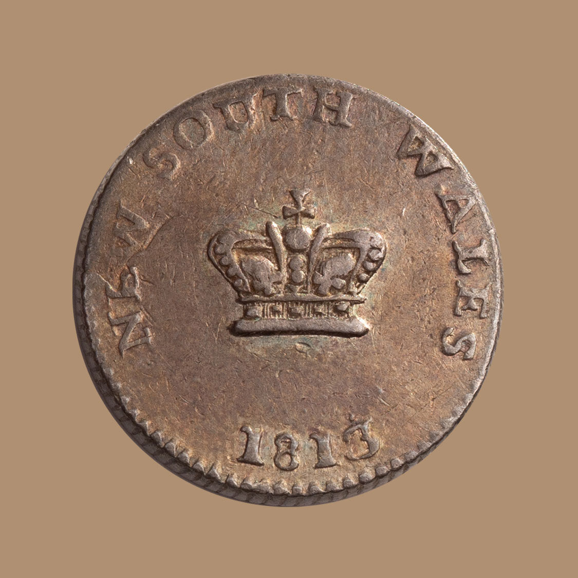 Struck with the A/1 dies, the crown is classically well-centred. The design details are chunky, strongly three-dimensional ... and by this we are referring to the crown with its fleur-de-lis and pearls, the legend New South Wales, the date 1813 and on the reverse, the value Fifteen Pence.