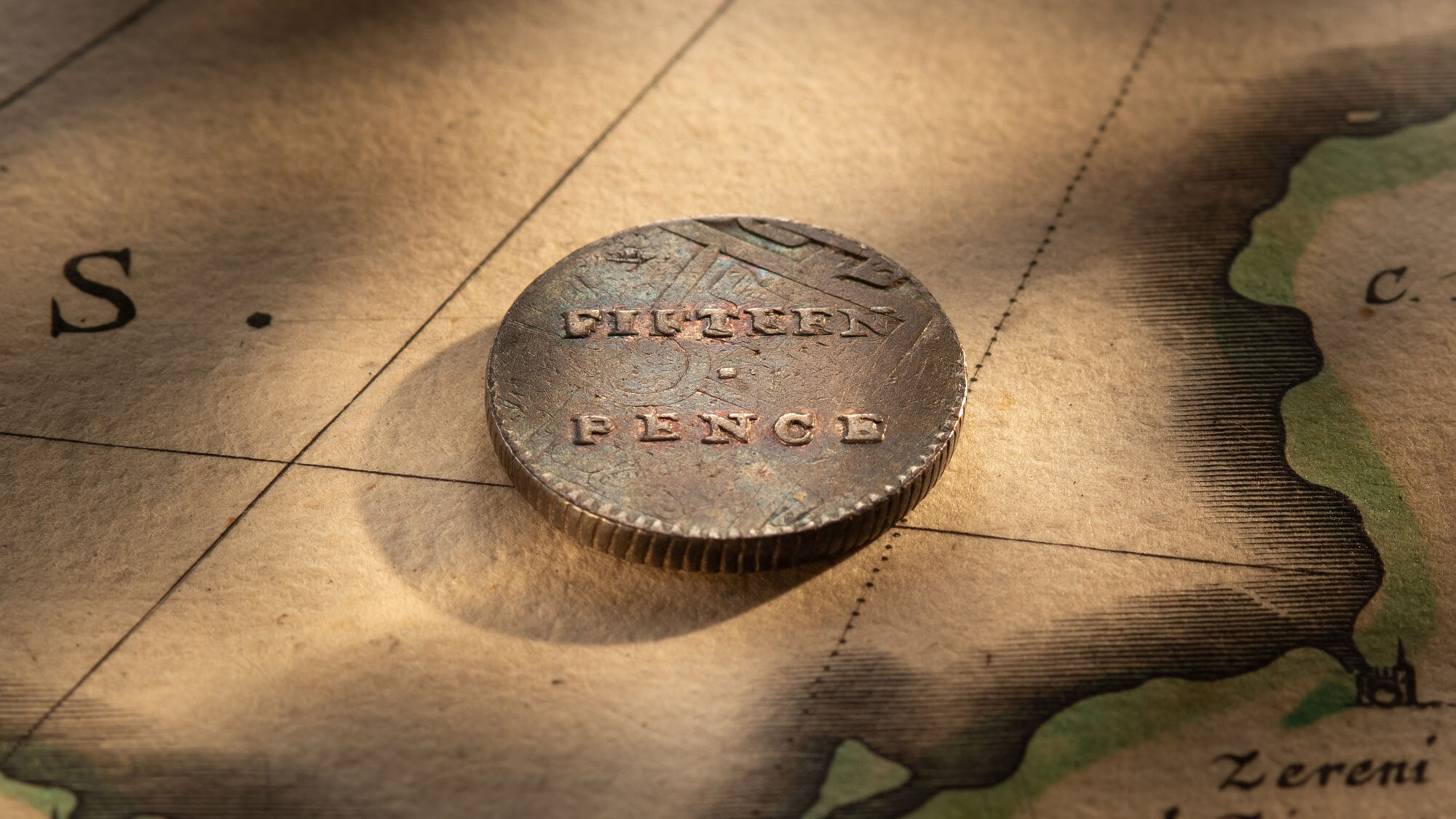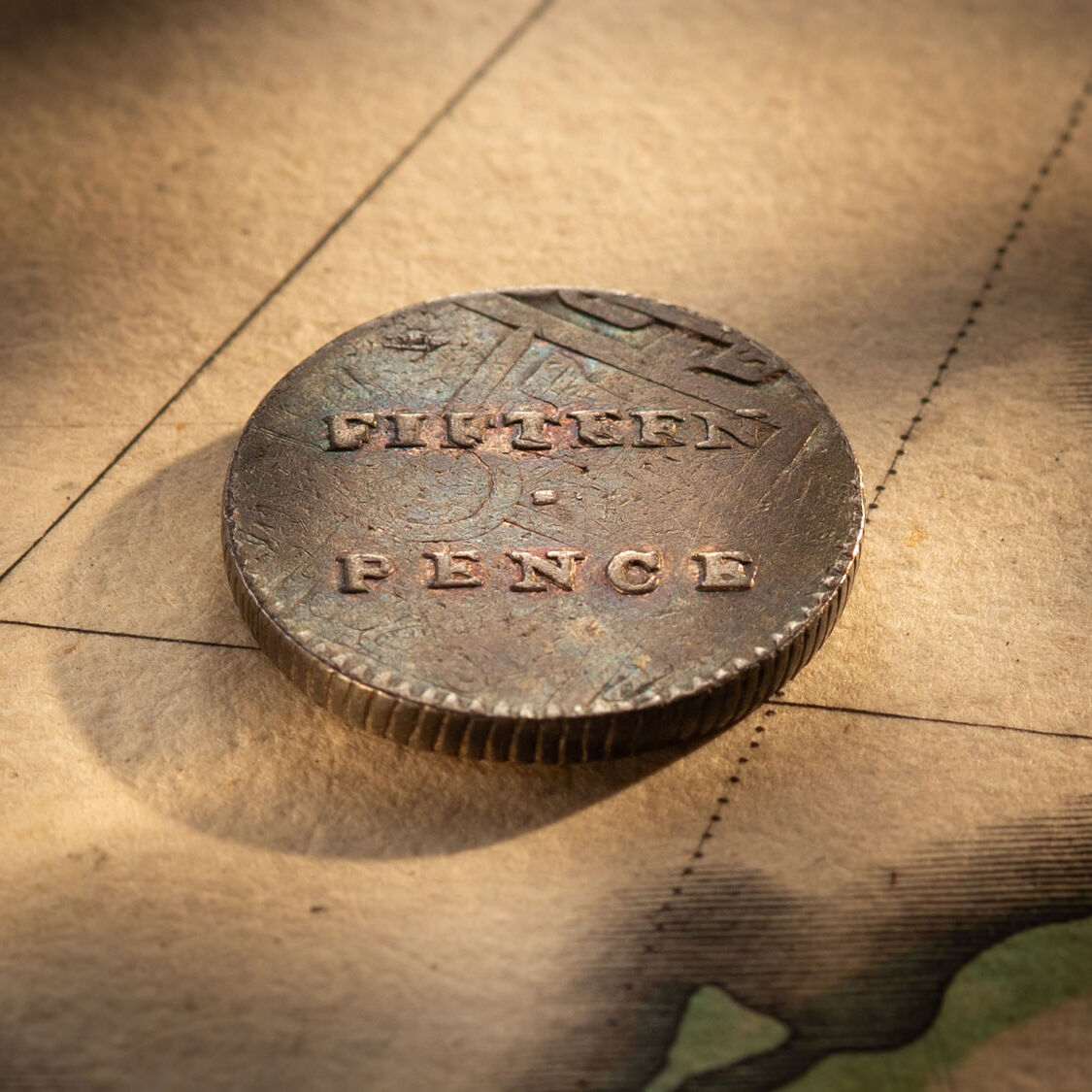 The under-type is particularly strong on this 1813 Dump, a backdrop to the words 'FIFTEEN PENCE'.