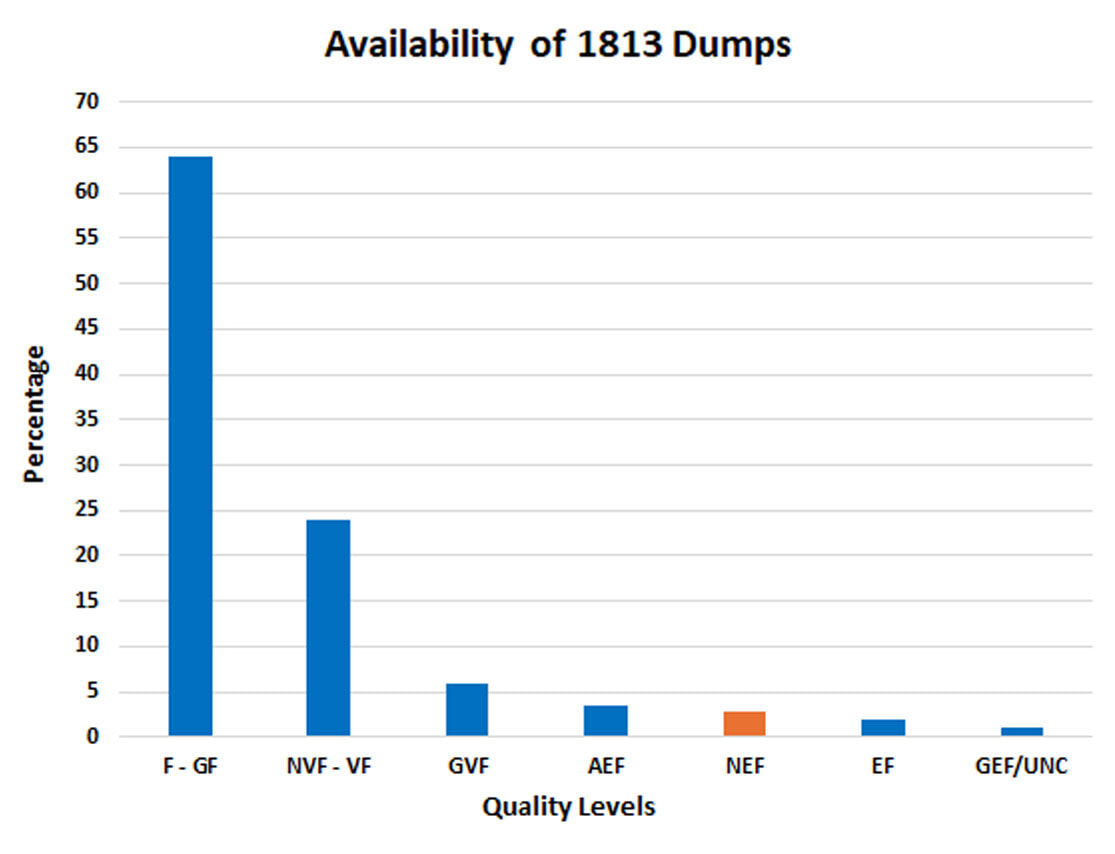Every circulated coin has a grading level at which serious rarity kicks in. That is the point at which the balance between acquiring a coin as a collectible - and as an investment - shifts more towards the latter. For the 1813 Colonial Dump that point is Good Very Fine.