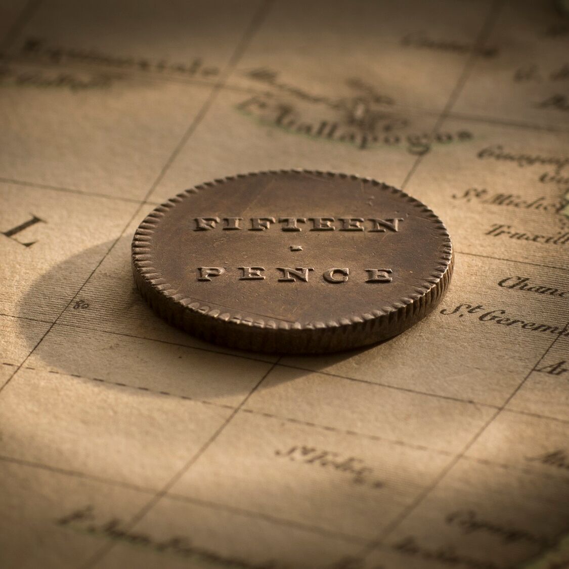The original design detail of the Spanish Dollar used to create this Dump is clear, surrounding the word ‘Fifteen Pence’. The cross bars, the castle and the lion are all evident .