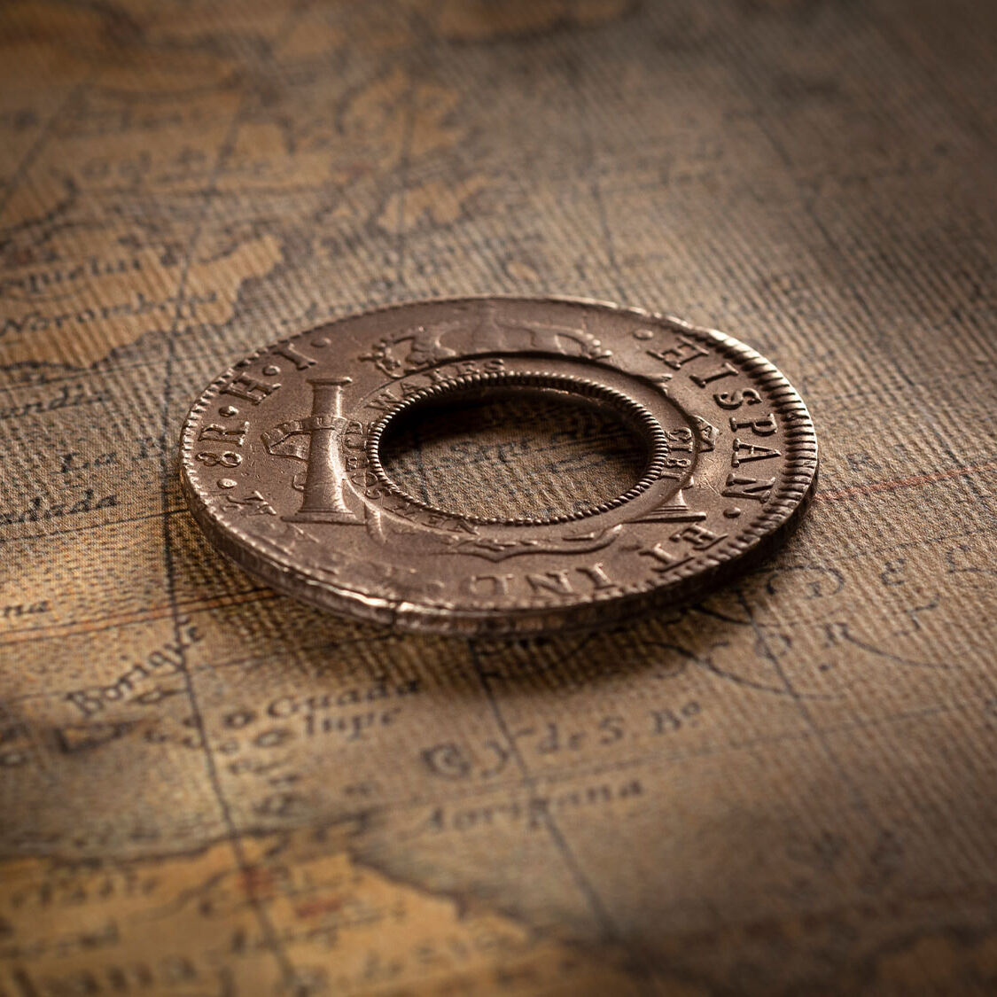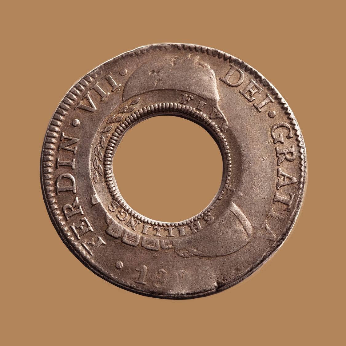 A Holey Dollar that is defined by the monarch Ferdinand VII.