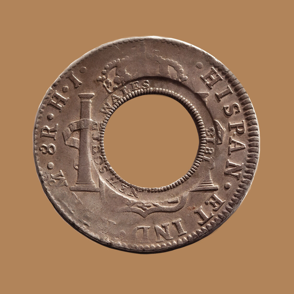 When William Henshall created this Holey Dollar, he grabbed a Spanish Silver Dollar that had been struck in 1809 at the Mexico Mint and that depicted the legend and portrait of King Ferdinand VII of Spain.