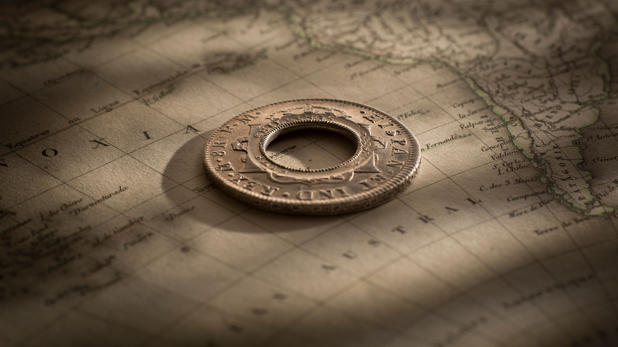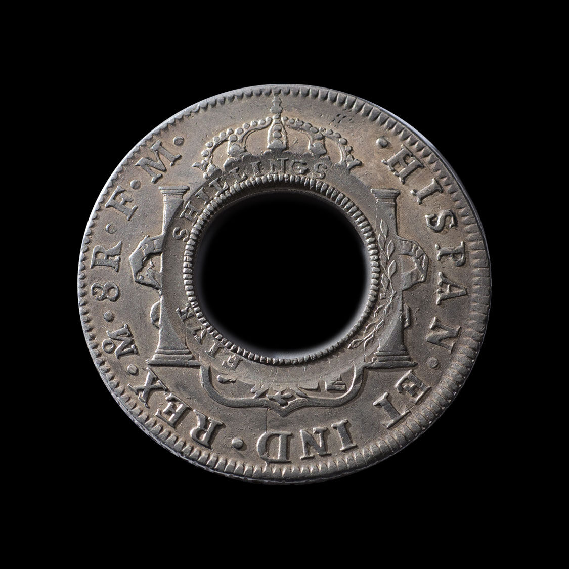The extent of usage of the Holey Dollar after it was released into circulation is evidenced by the wear to the counter-stamps, the over-stamping around the inner circular edge … New South Wales, 1813 and Five Shillings.