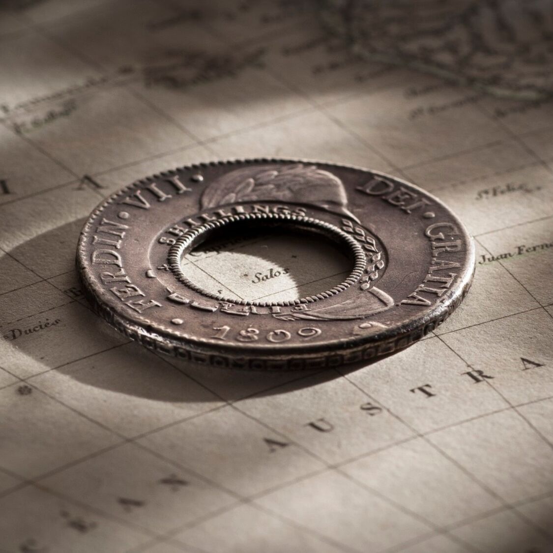 When William Henshall created this Holey Dollar, he grabbed a Spanish Silver Dollar that had been struck at the Mexico Mint in the year 1809 and that depicted the legend and portrait of Ferdinand VII of Spain.