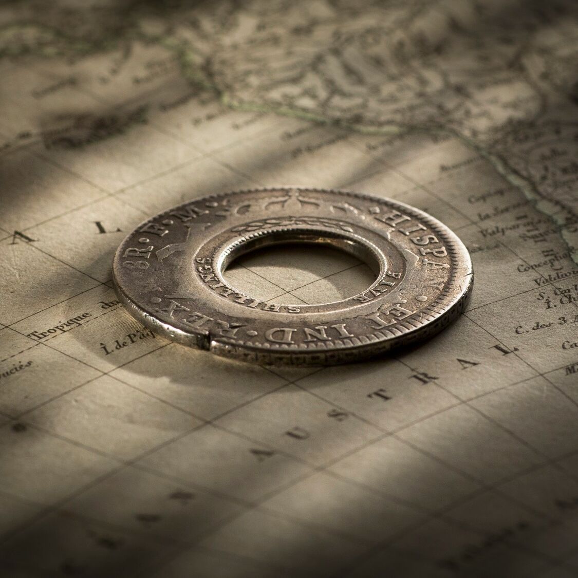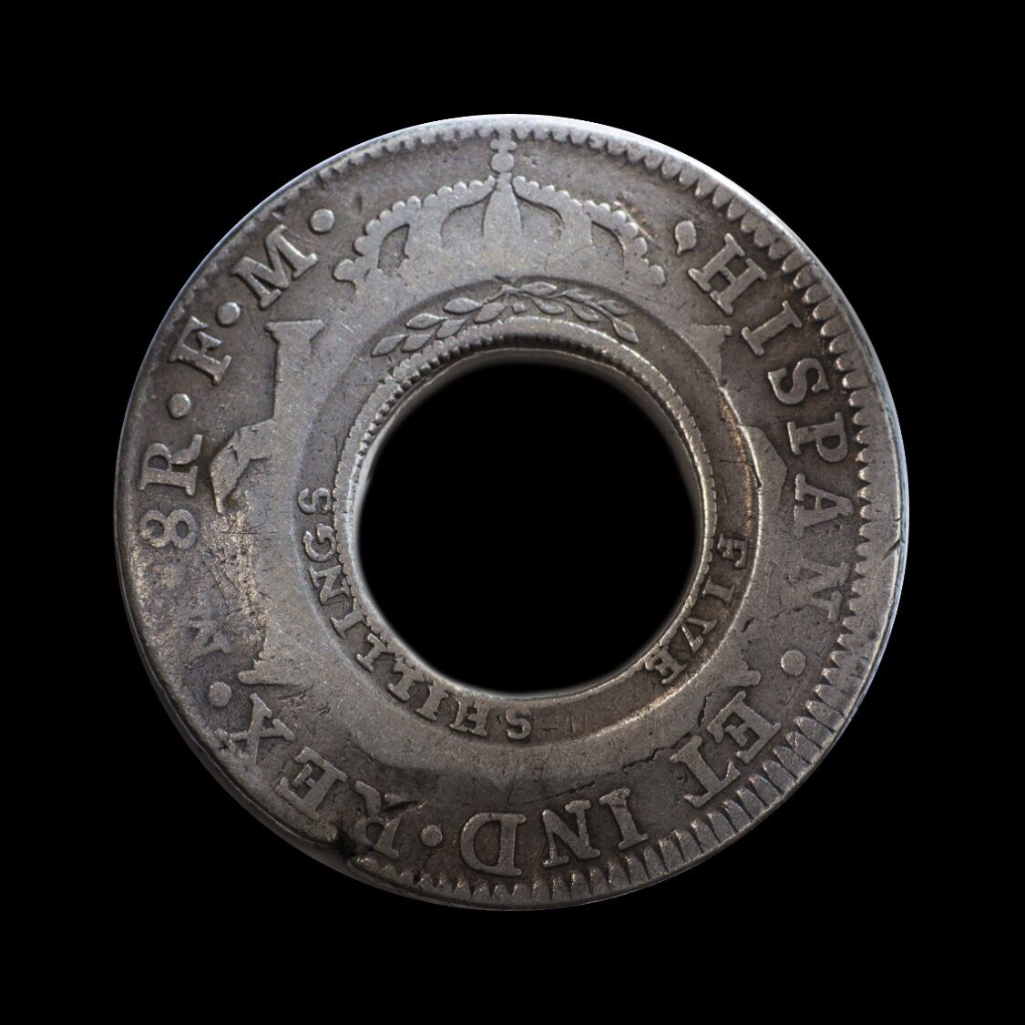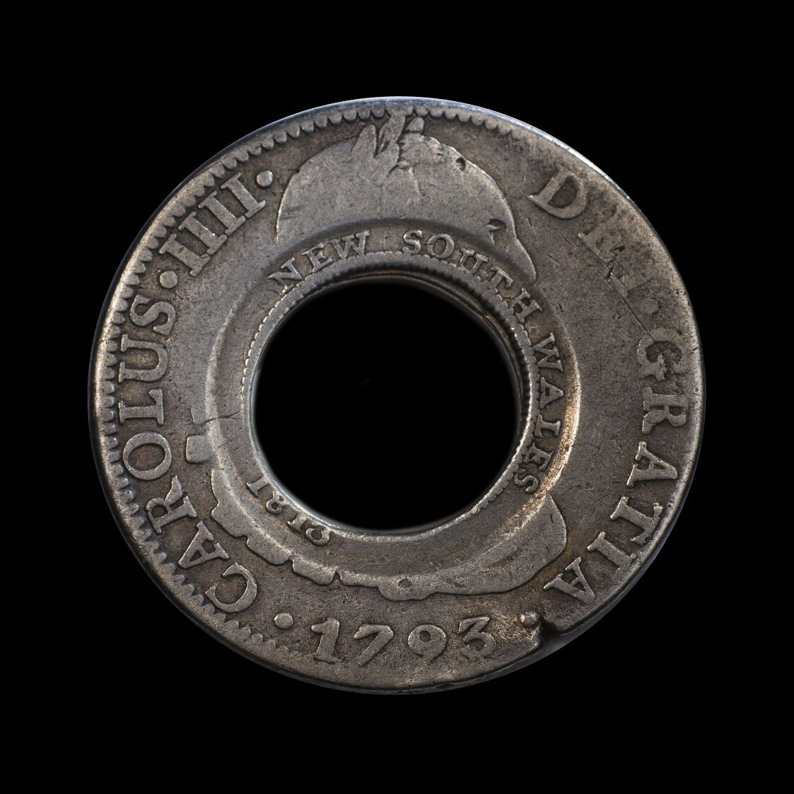 When William Henshall created this coin, he picked a 1793 Spanish Silver Dollar that had been struck at the Mexico Mint. Using crude equipment, he cut a hole in it.