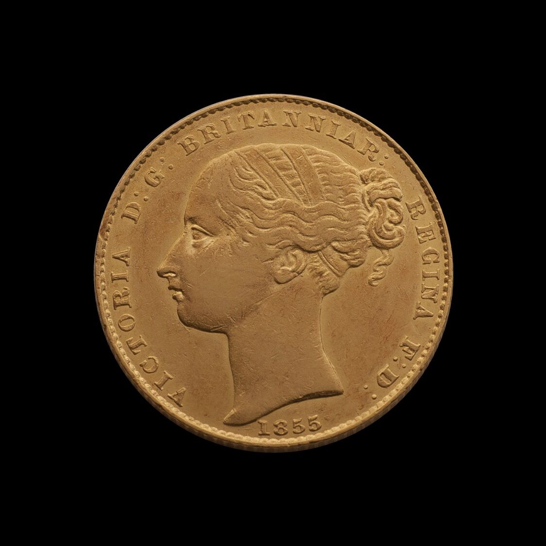 Obverse of the 1855 Sydney Mint Sovereign showing Queen Victoria with a braid in her hair.