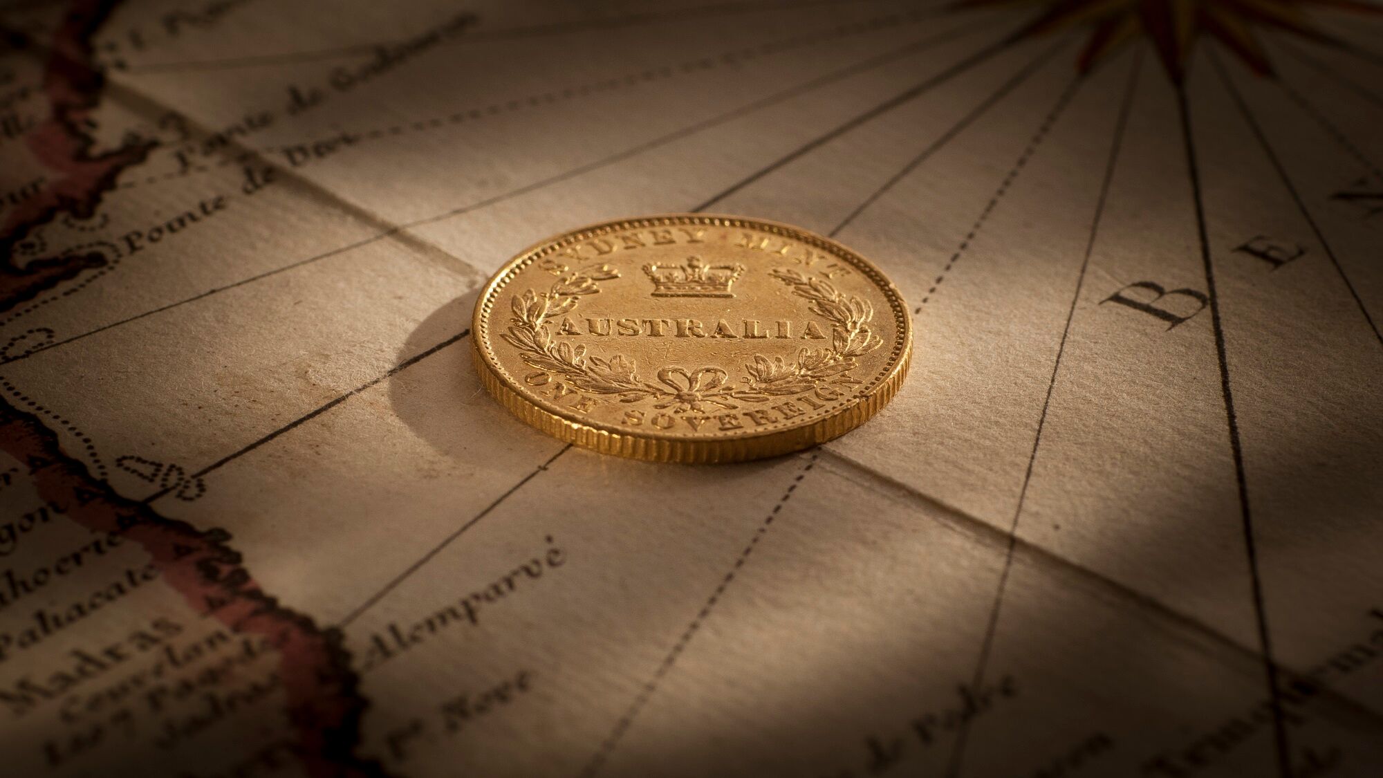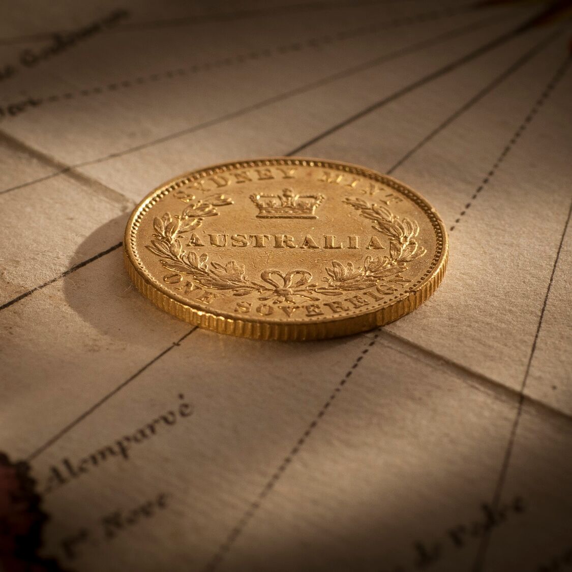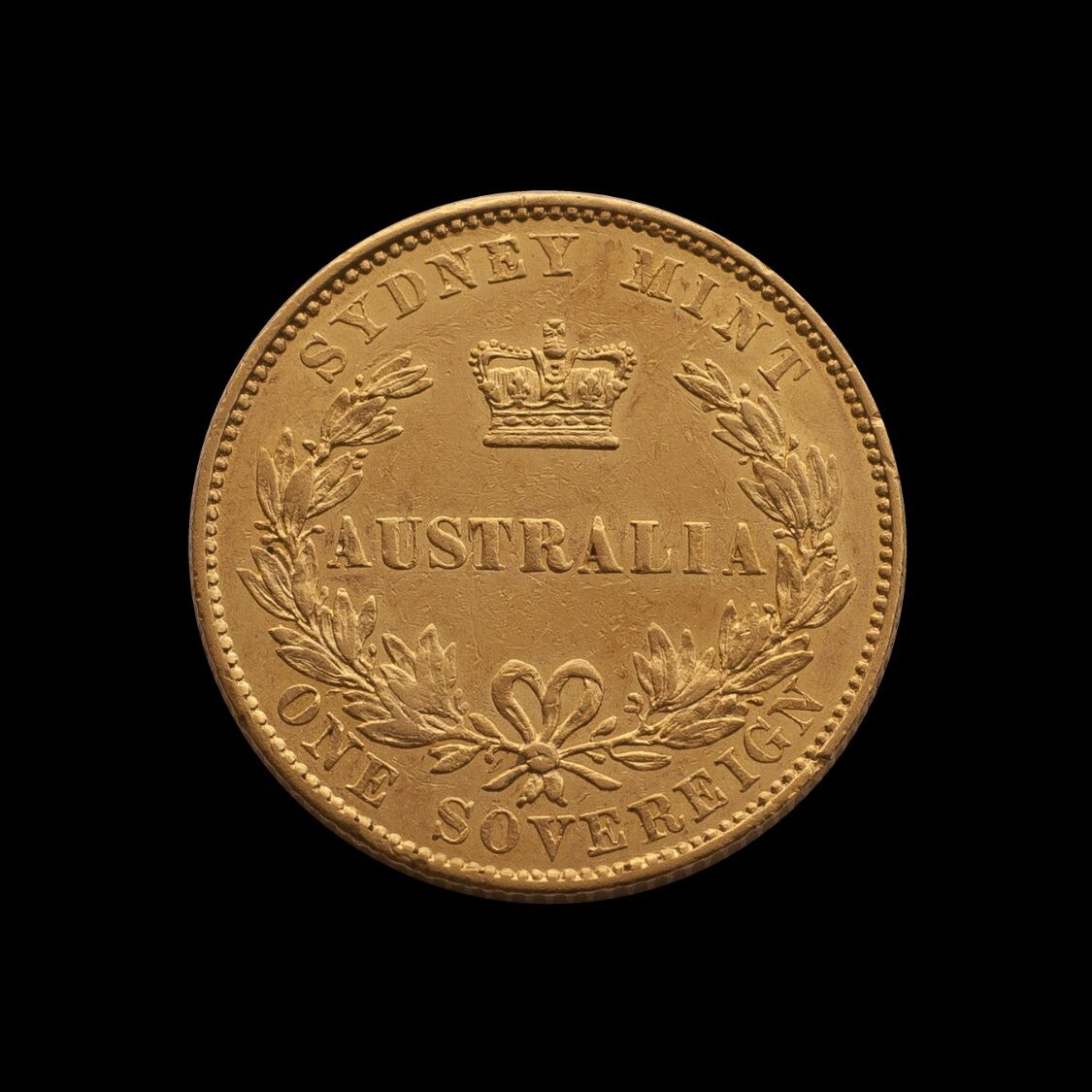 Reverse of the 1855 Sydney Mint Sovereign with the word 'AUSTRALIA' emblazoned across the coin.