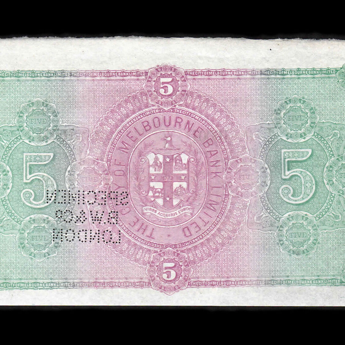 Archived for more than a century by London engravers and printers Bradbury & Wilkinson, this City of Melbourne Bank Ltd Five Pounds has retained its original characteristics and original colour unaffected by the passing of time.