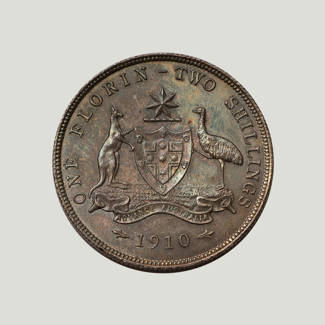 Reverse of the 1910 Specimen Florin depicting the Commonwealth of Australia Coat of Arms.