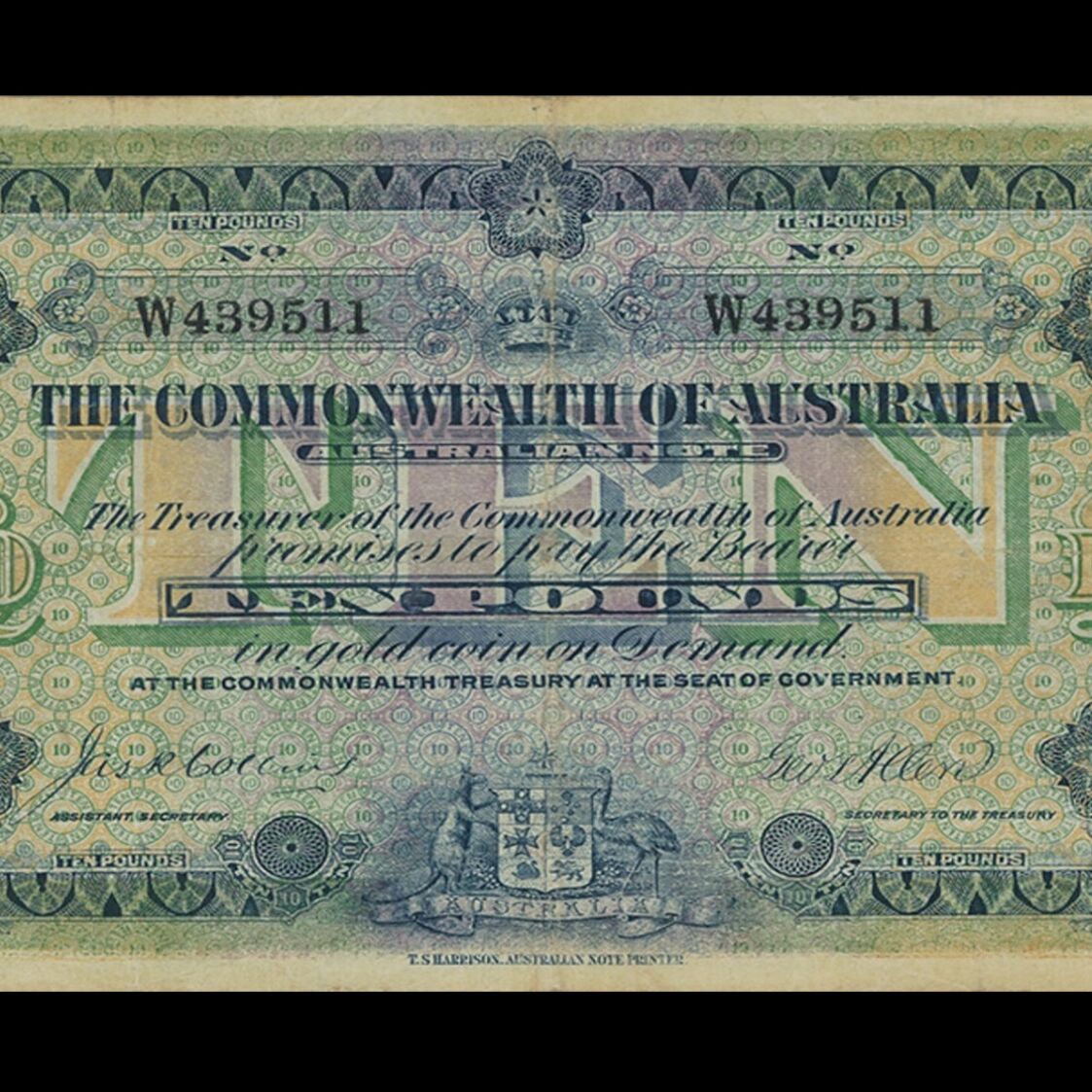Back to a time when George V was the ruling monarch. And the average Australian weekly wage was less than three pounds, this note therefore representing a gargantuan amount. More than three weeks wages.