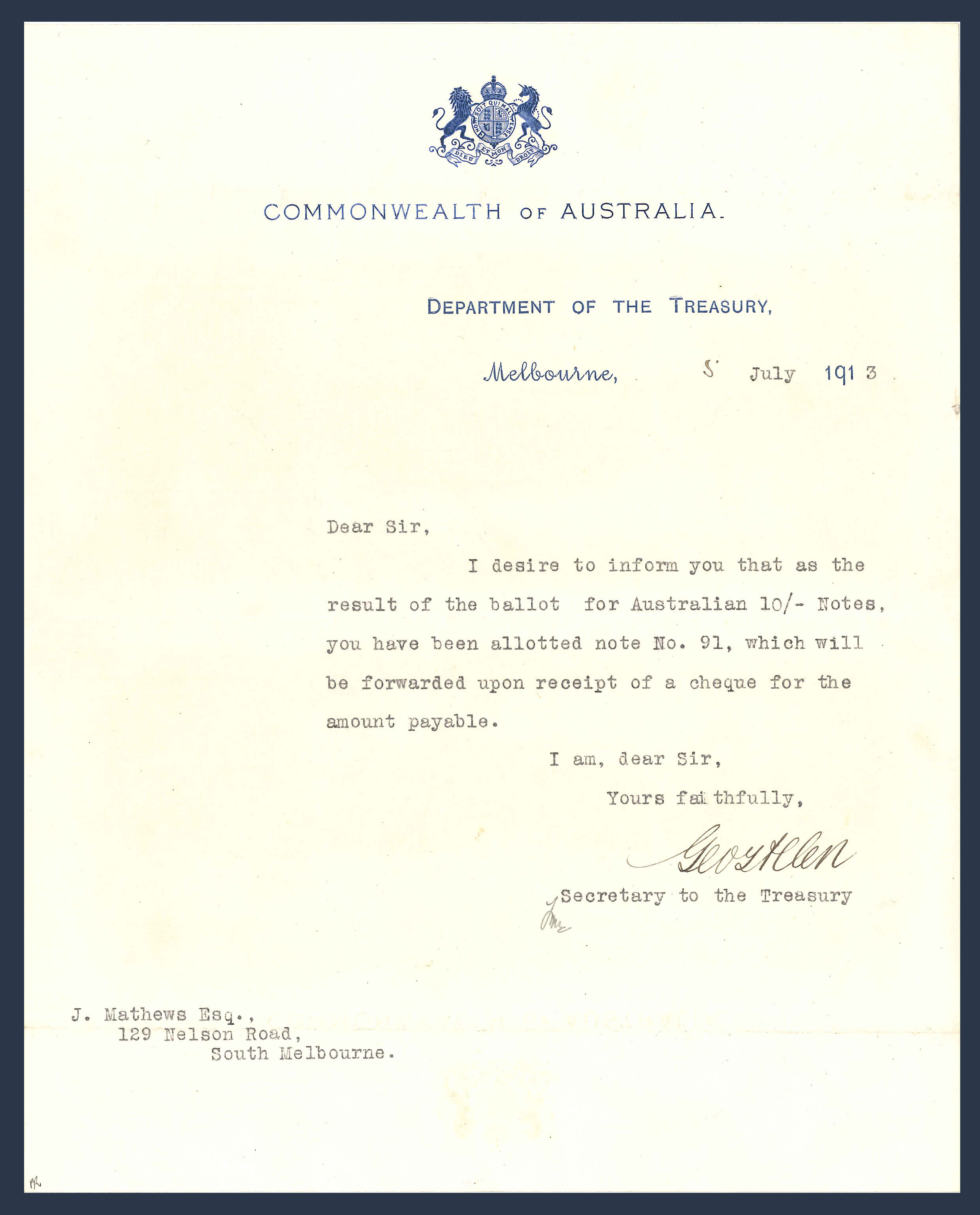 Prime Minister Andrew Fisher fulfilled a promise to the nation when he introduced the Commonwealth of Australia’s first banknote in 1913. The note, a Ten Shillings with the signatories of James Collins and George Allen, enjoyed a grandiose release on 1 May 1913 at Melbourne's King’s Warehouse in front of Australia's political and social elite. The notes were printed in sheets of four and cut into single banknotes. Precisely at 3pm, under the supervision of Note Printer Thomas Harrison, a numbering ceremony began, each note individually numbered by hand in red ink. One hundred and two Presentation Notes were distributed by ballot to ensure a fair distribution, paid with the equivalent of a half sovereign. This Presentation Note is hand-numbered M000091 and was secured in the ballot by Jim Mathews, Federal Member for Melbourne Ports and is sold with his letter confirming success in the ballot. The pristine state of the note suggests that Mathews may have collected his prize (as distinct from being pinned to the letter and sent by mail to the recipient) for this Ten Shillings does not have pinholes. Nor has it been folded. Mathews also managed to secure the signature of the Prime Minister Andrew Fisher on the reverse. This Presentation Note and accompanying ballot letter is an investment in history and is available now.