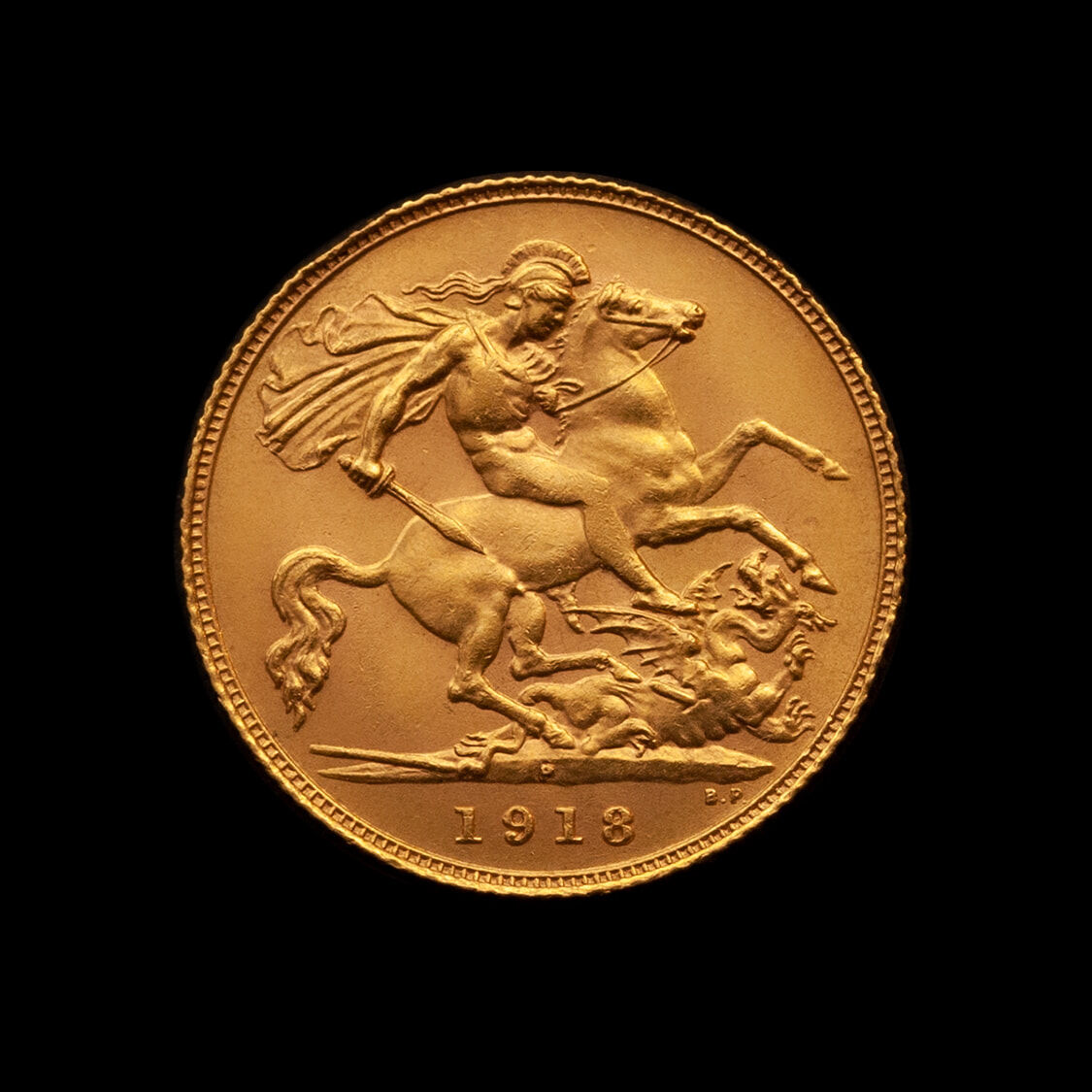 The 1918 Half Sovereign was struck at the Perth Mint and features the obverse portrait of King George V.