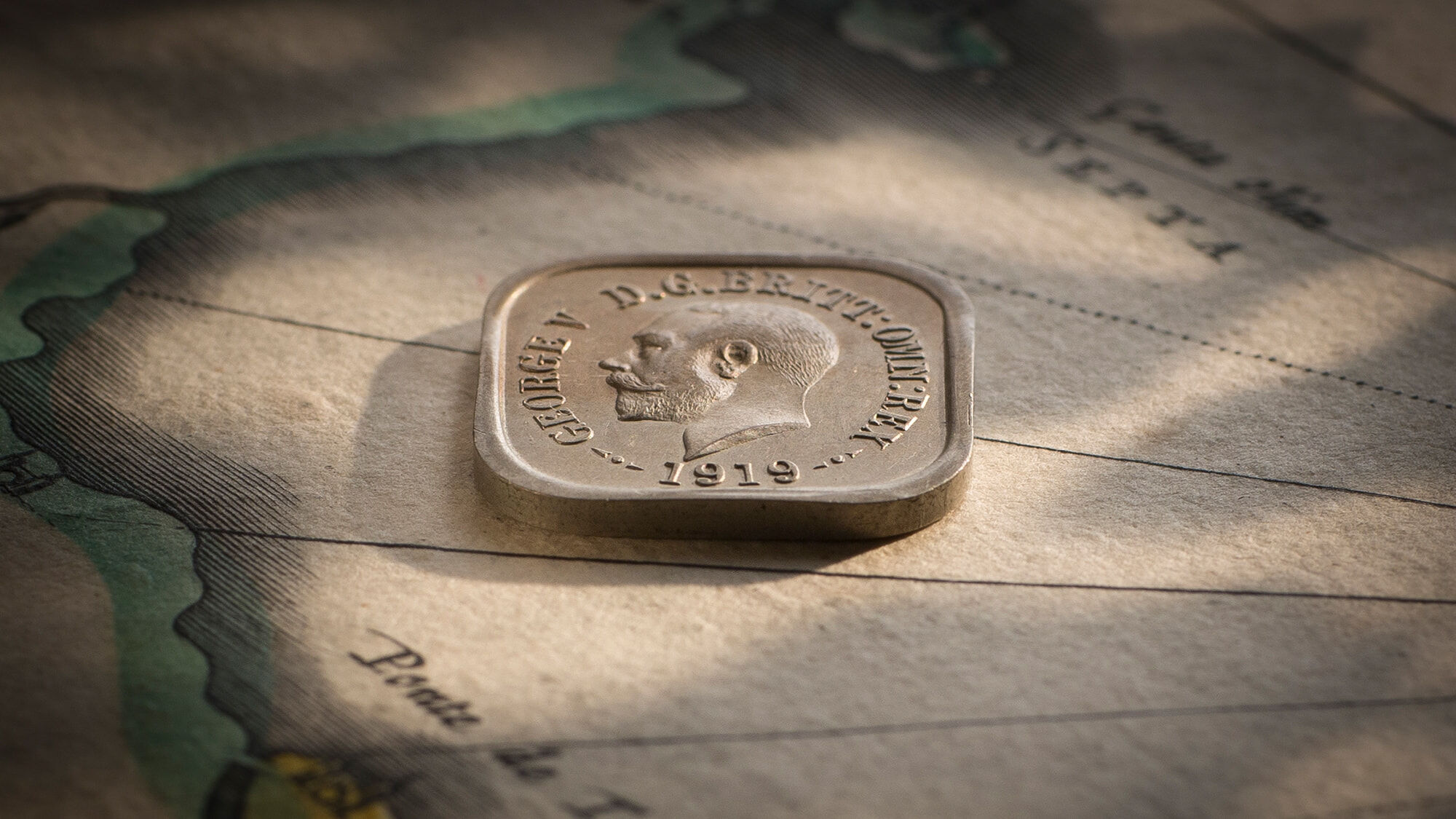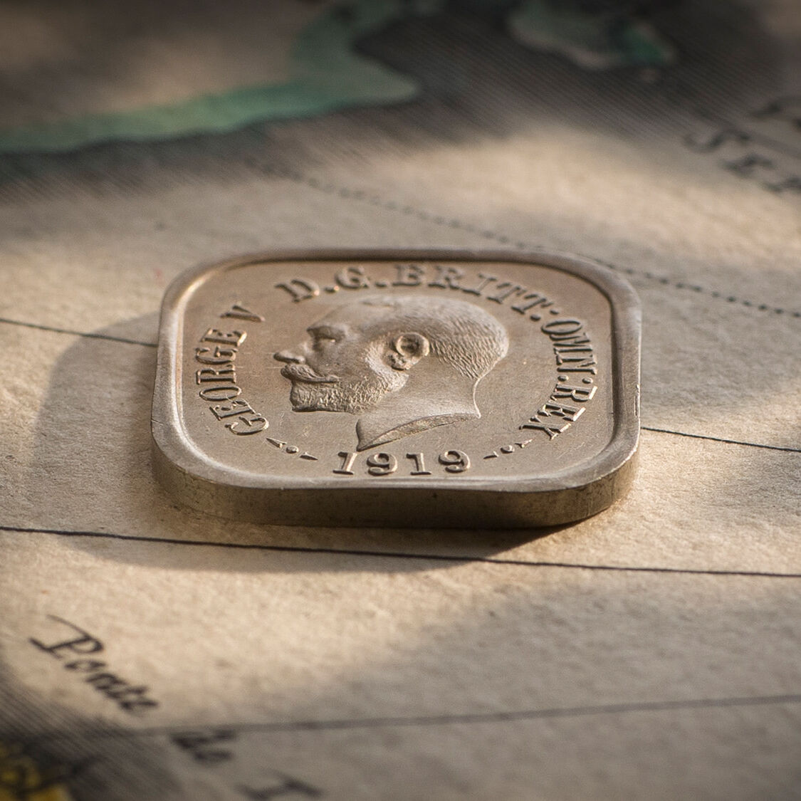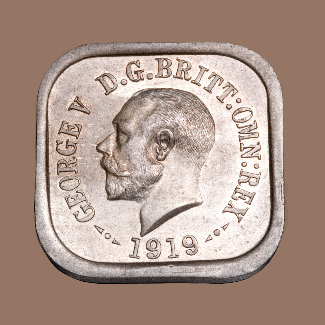The 1919 Kookaburra Penny type 5 with a highly detailed portrait of George V (minus the crown), offset by reflective mirror fields.