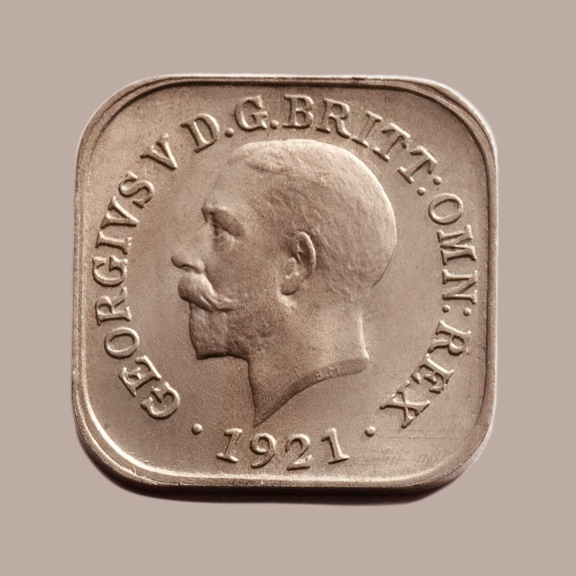 The 1921 Square Halfpenny obverse featuring an uncrowned King George V. The legend and portrait both highly detailed.