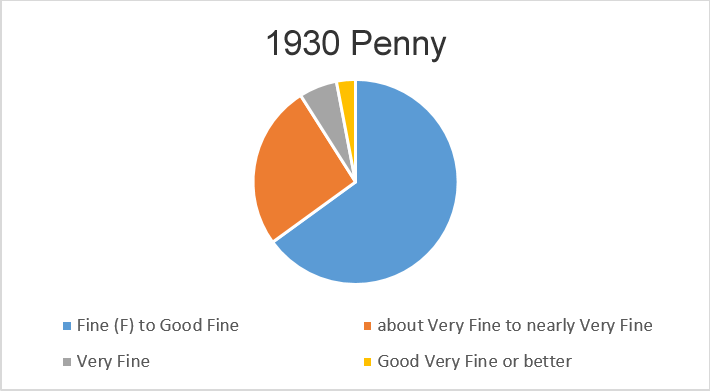 The accidental minting of the 1930 Penny was not discovered until the 1940s. That the 1930 Penny underwent at least a decade of circulation before it was discovered means that most of the surviving examples are well circulated, with edge bumps and field marks. The pie chart below clearly shows the extreme scarcity of 1930 Pennies in a quality level of Good Very Fine or better.