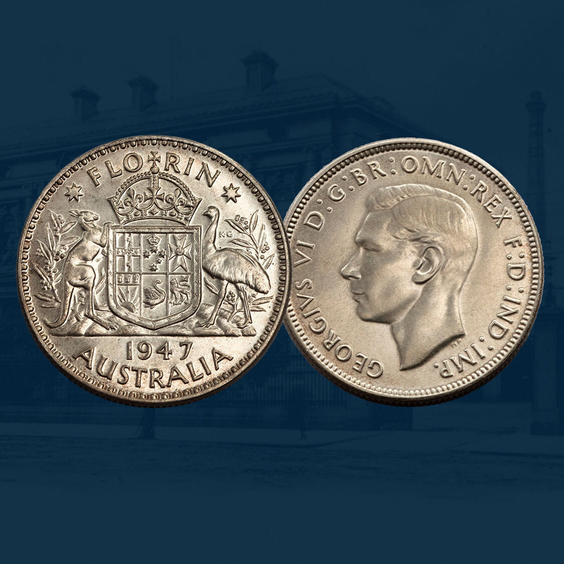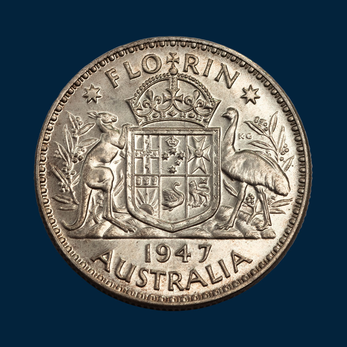 A stunning 1947 Proof Florin, featuring Australia’s new Coat of Arms design on the reverse and the portrait of George VI on the obverse.