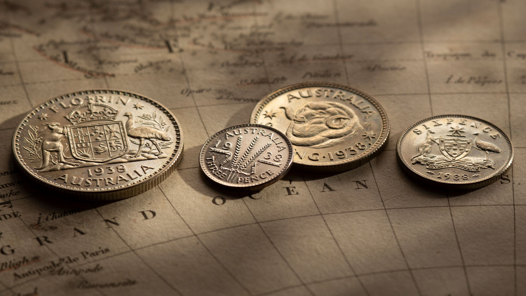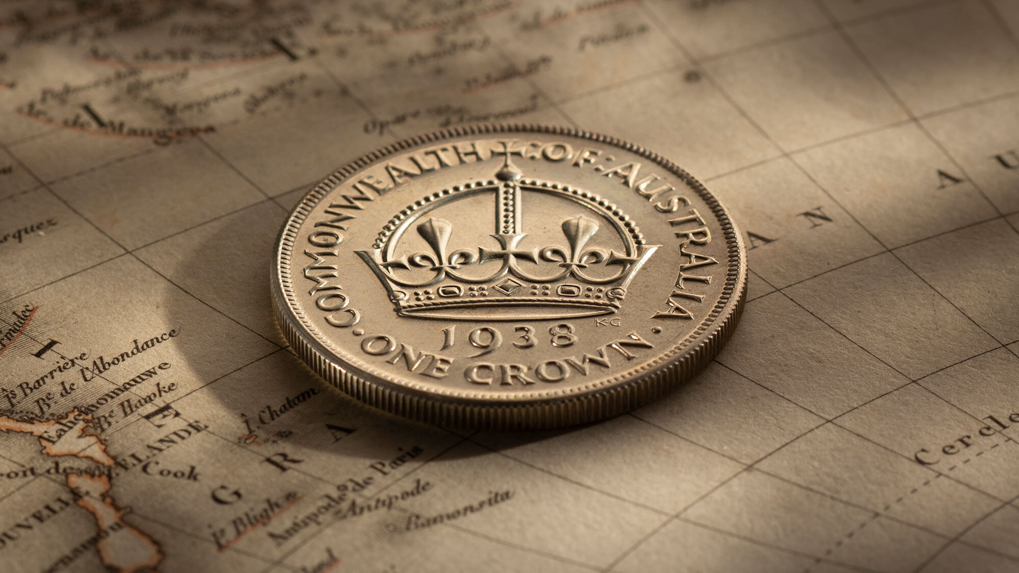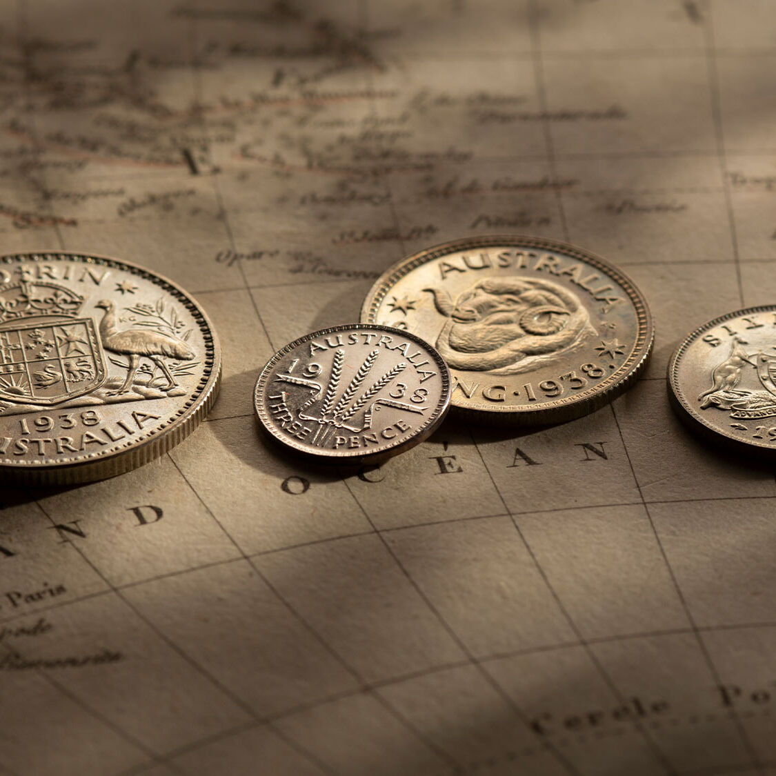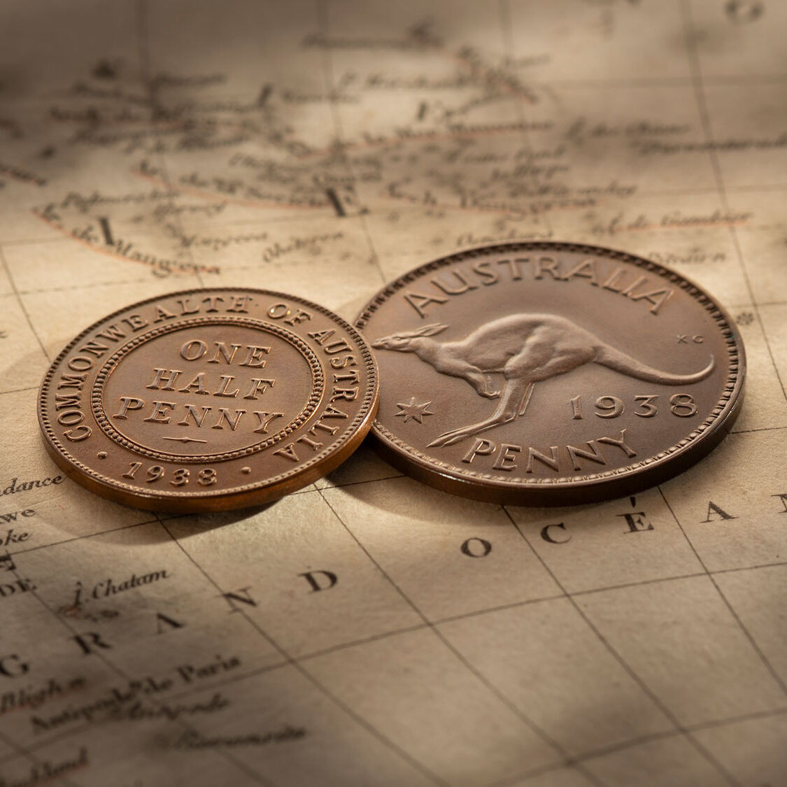 Treasury commissioned the Melbourne Mint to strike the full range of Australia’s circulating coinage in 1938, the five silver coins of crown, florin, shilling, sixpence and threepence and the copper penny and halfpenny.