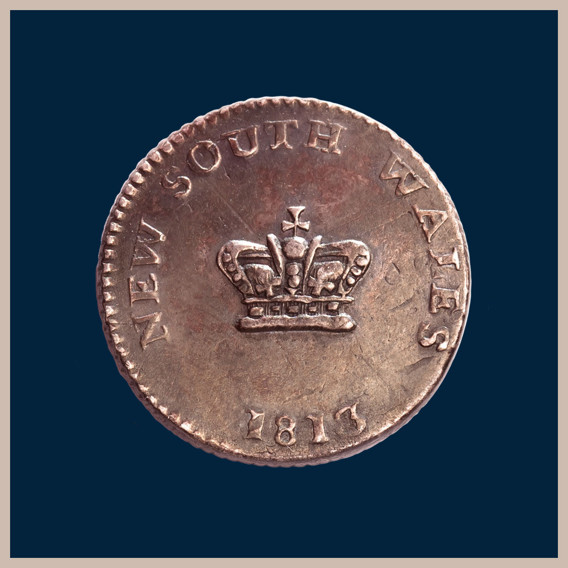 When you look at this 1813 Dump in your hand, the fields are like glass and very reflective. The design details are super-fine and clearly visible to the naked eye. And that’s a sign of a high-quality coin. This is a superior quality example of the nation’s first coin, technically ranked in the top five per cent. Over and above its quality ranking this coin has attributes that are highly prized, traits that you simply don't see in every Dump. For a start there is the 'H’ for Henshall on the reverse, the mark left by the nation’s first mint master that guaranteed his fame. On the obverse, there also is evidence of the original Spanish Dollar design from which it was created. Intact edge milling, the minting authority's ploy to prevent clipping of slivers of silver from the edges. And the elusive dot above the ‘3’ in the date 1813. A Dump that offers the lot.