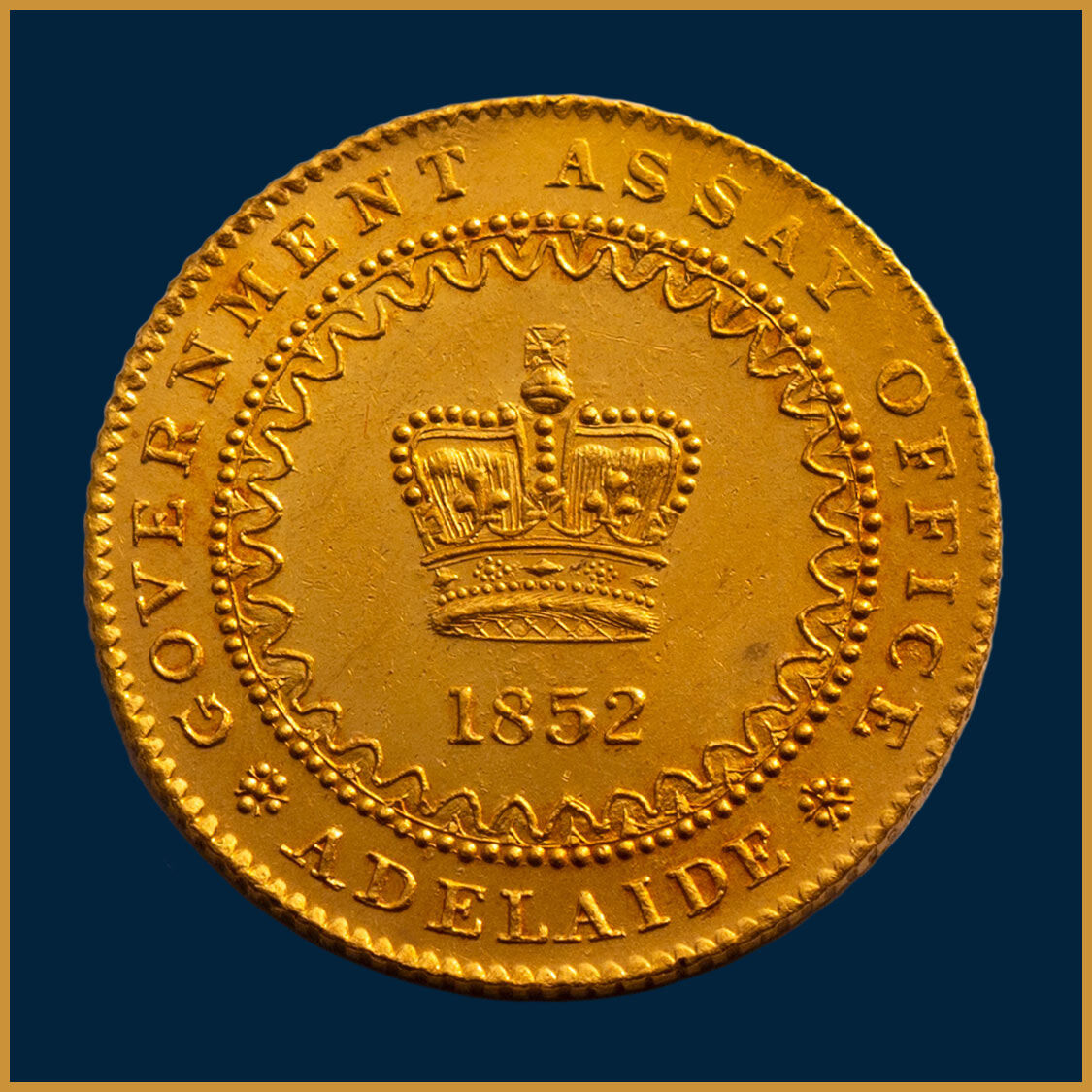 The nation’s first gold coin was produced over two production runs. The same obverse design was used throughout, featuring the legend 'Government Assay Office Adelaide', a crown and the date '1852'.
