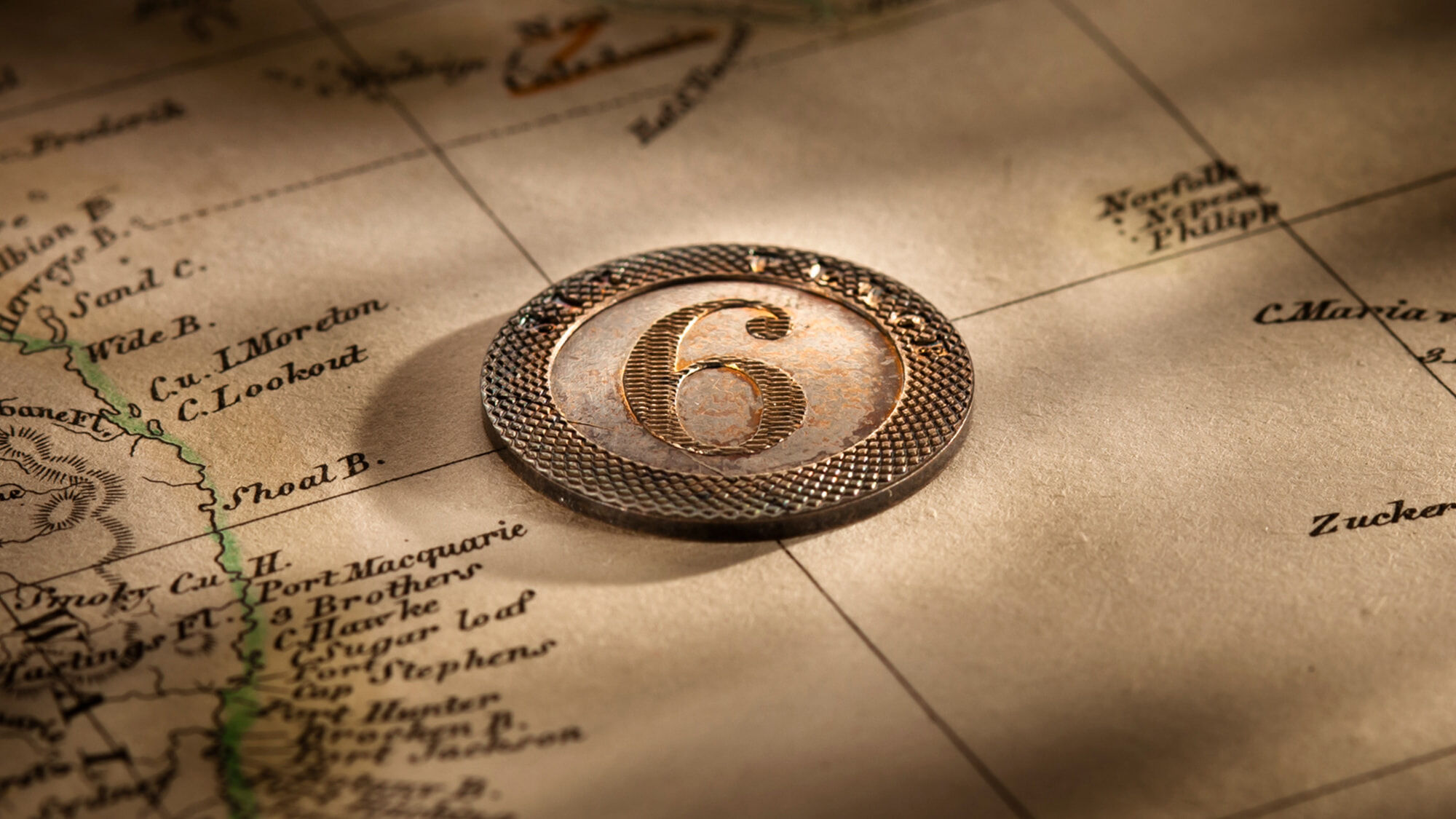 Displays a broad engine-turned rim encircling a large figure ‘6’ in the centre and the words SIX PENCE embedded in the rim.