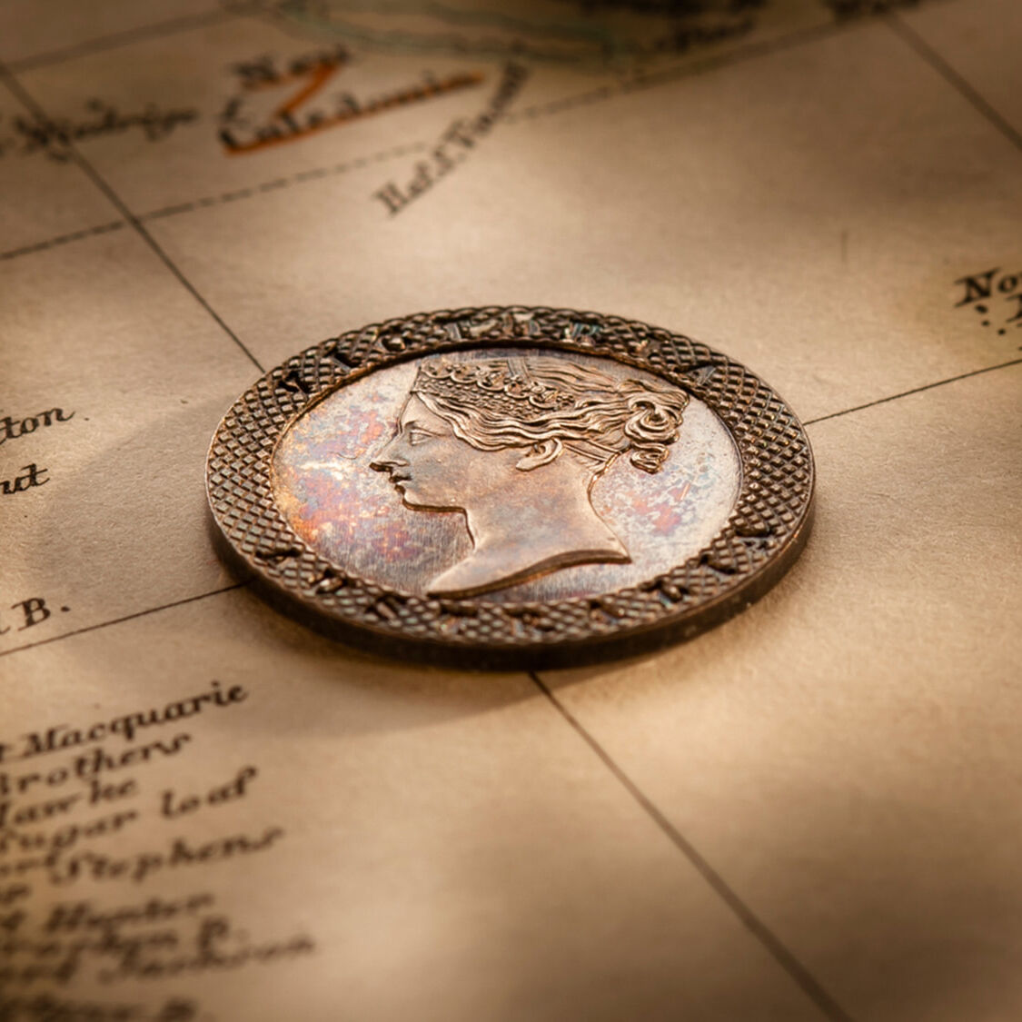 Displays a broad engine-turned rim encircling a superb portrait of Queen Victoria and the words VICTORIA and AUSTRALIA embedded in the rim.