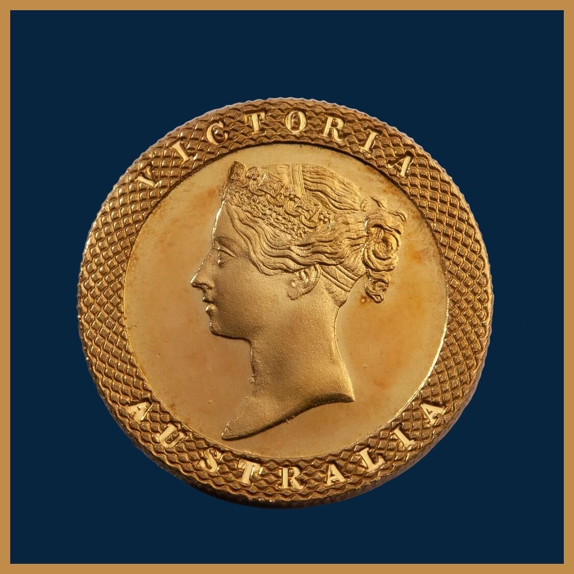 Obverse: A broad raised engine-turned rim encircles a superb portrait of Queen Victoria wearing a jewelled crown, thought to be executed by William Taylor in 1855, and the words VICTORIA and AUSTRALIA incused in the rim.