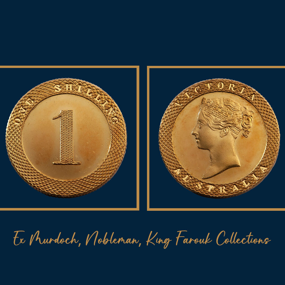 This Kangaroo Office Gold Shilling was first sighted in London in 1904, as part of the esteemed John G. Murdoch Collection. No other examples are known. Leafing through the bound editions of the early catalogues of 1904 (John G. Murdoch), 1922 (Baron Philip Ferrari La Renotiere) and 1954 (King Farouk), you are in no doubt of the enormous historical and numismatic significance that this piece carries. It embodies history. The Gold Kangaroo Patterns are at the top of their class and this gold shilling is the best in its category, struck with a grained edge indicating that it was minted circa 1855. Exceptional design. Unique style. Rich in history. A piece that has global standing. This Kangaroo Office Gold Shilling is a 'trophy' piece.
