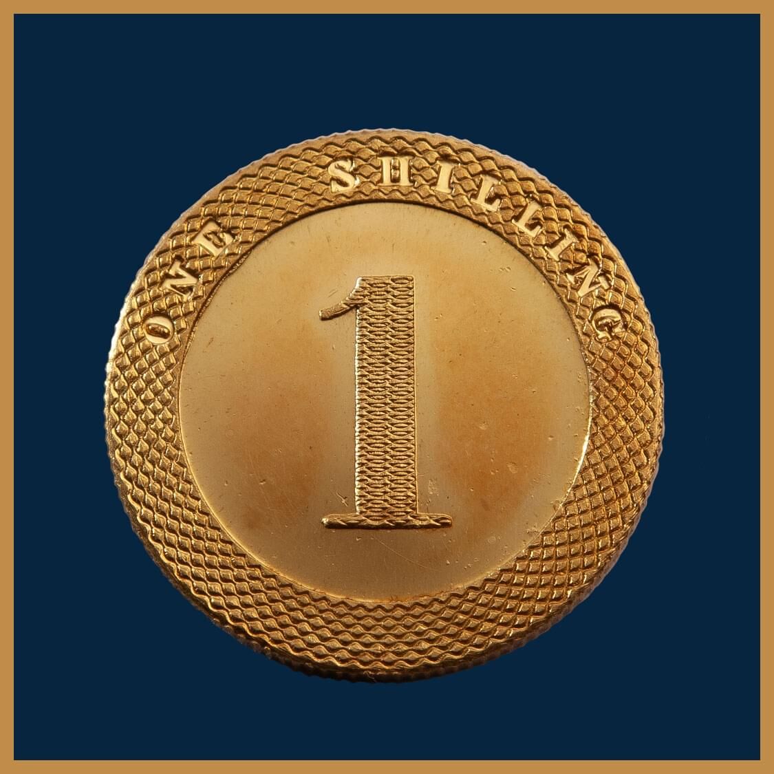 Reverse: A broad engine-turned rim encircles a large figure ‘1’ in the centre decoratively engraved and the words ONE SHILLING incused in the rim.