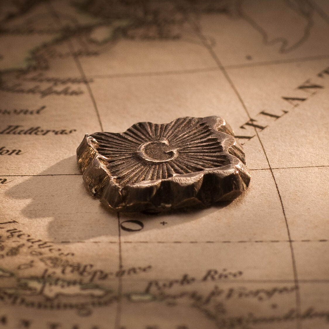 This square centre segment was cut out of a Spanish Silver Dollar and features crenellated edges and is counter stamped with a ‘G’ for Guadelope.