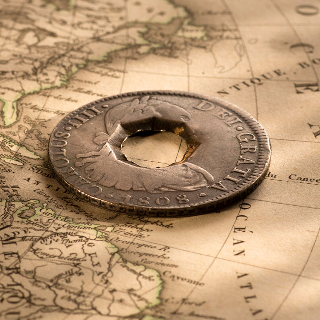 Extremely rare Trinidad Holey Dollar struck in 1811 from an 1808 Charles IV Spanish silver dollar