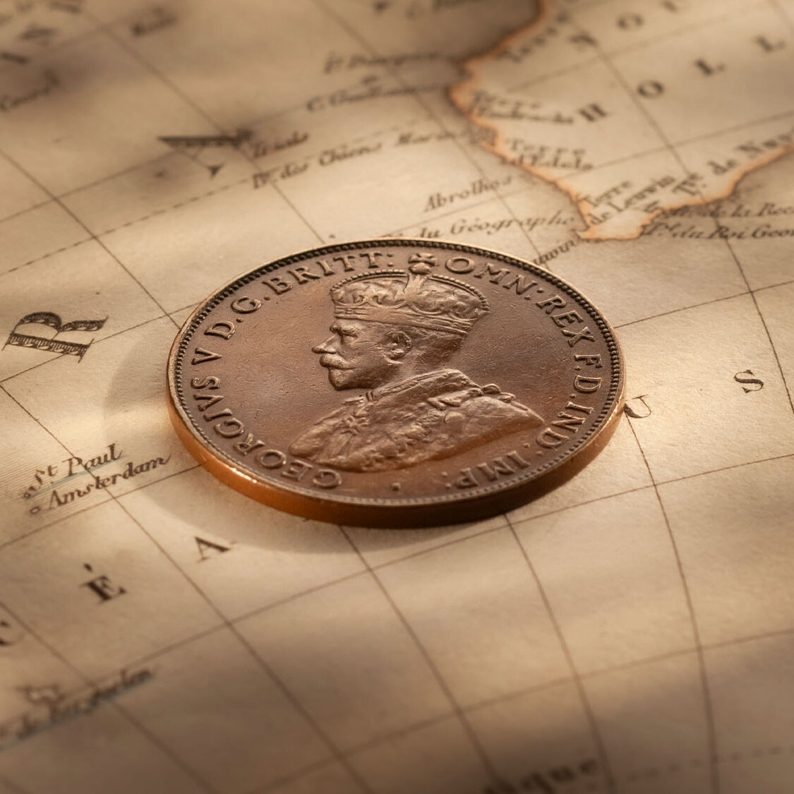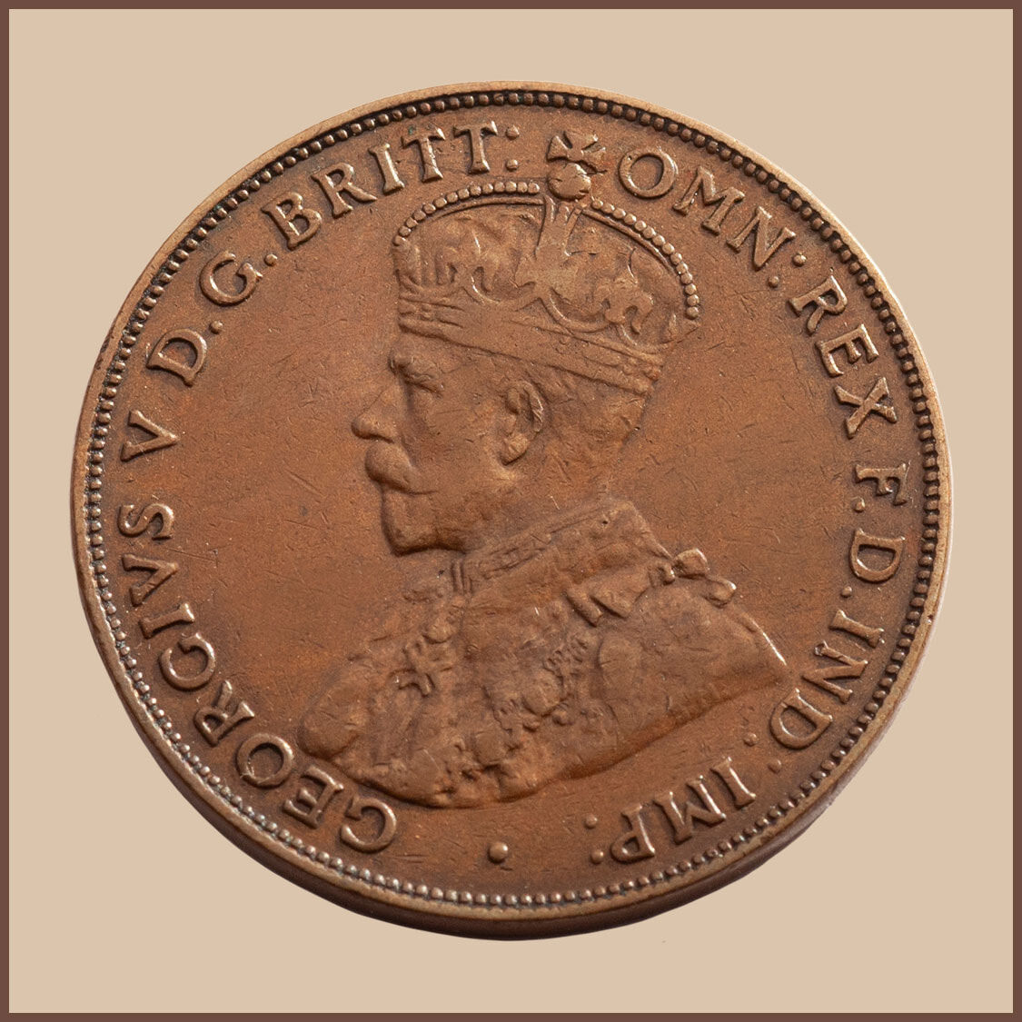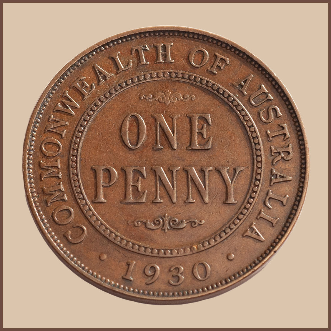 Commonwealth of Australia 1930 Penny struck at the Melbourne Mint, featuring the portrait of King George V designed by Bertram Mackennal.