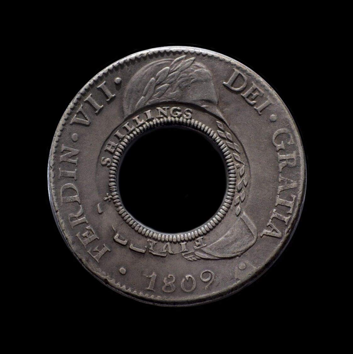 When William Henshall created this Holey Dollar, he grabbed a Spanish Silver Dollar that had been struck at the Mexico Mint in the year 1809 and that depicted the legend and portrait of Ferdinand VII of Spain.