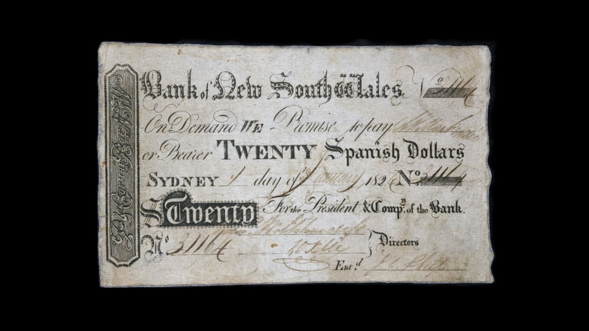 Australia's very first dollar banknote issued on 1 January 1824 by the Bank of New South Wales (now Westpac).