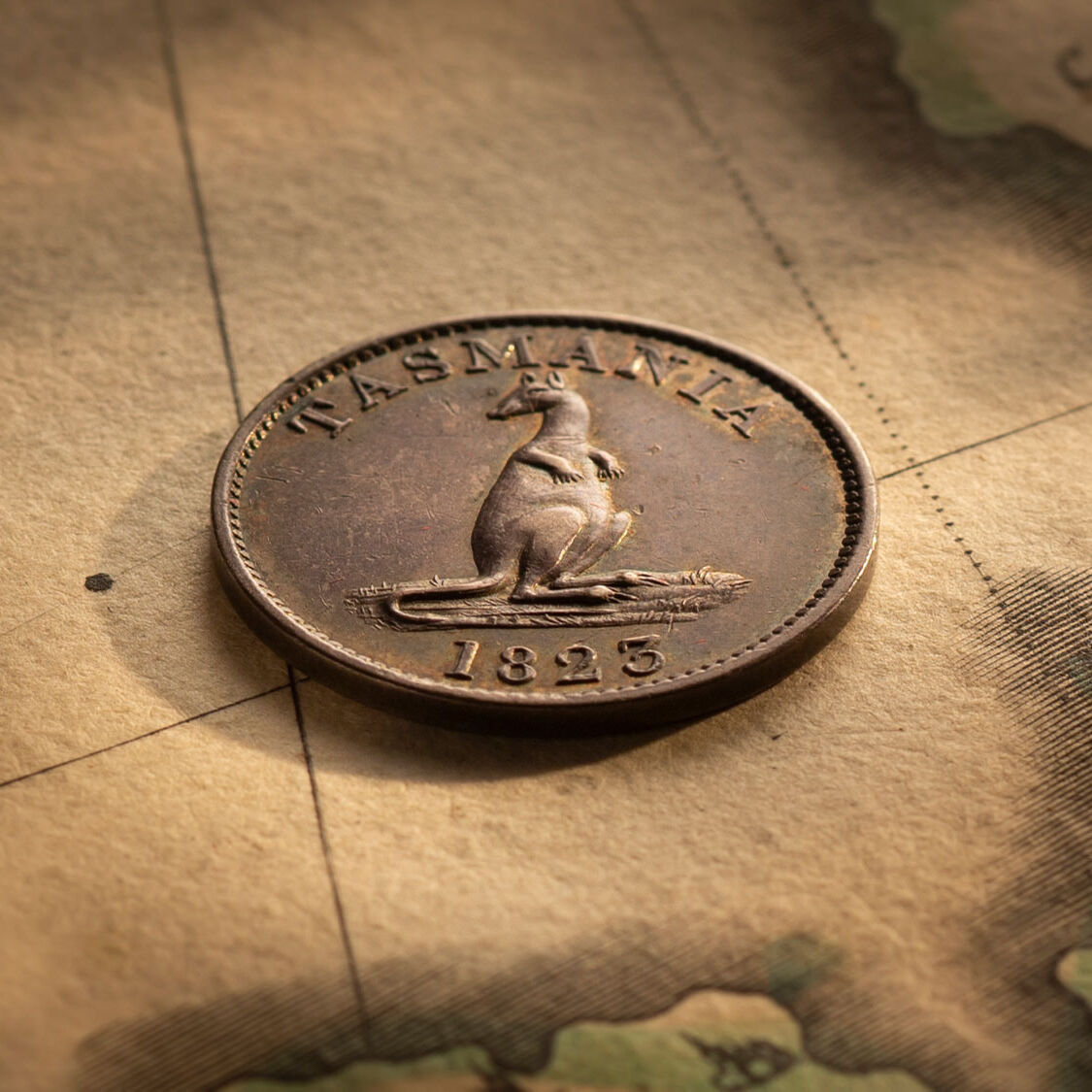 The 1823 Tasmania Shilling is Australia’s first private coin issue. It is extremely rare with perhaps thirty pieces known, this piece placed in the top tier quality-wise. The issue was financed by British entrepreneurs, Hugh MacIntosh and Peter Degraves, the design featuring a kangaroo and the name 'Tasmania', both of which are noteworthy. It was the earliest depiction of a kangaroo on an item of decorative art available for private ownership. And the first item of decorative art to feature the name Tasmania, rather than Van Diemen's Land. According to Australian author Greg Jeffreys these two gentlemen ultimately changed the course of Australia's history for by 1834 they had built two mills, founded the Cascade Brewery that today is Australia's oldest continually operating brewery. Spearheaded the establishment of Australia's oldest theatre, the Theatre Royal in central Hobart. And facilitated the writing of Australia's first novel by convicted forger and author, Henry Savery. This Macintosh & Degraves Shilling brings history to life with a direct link to two men who were "movers and shakers" in Tasmania’s colonial economy.
