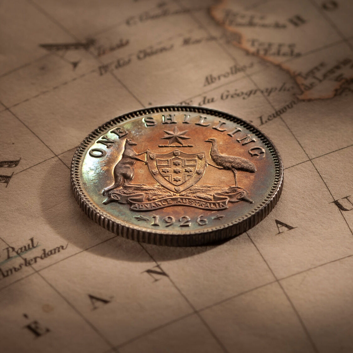 This 1926 Proof Shilling was formerly owned by three numismatic luminaries, Philip Spalding, Barrie Winsor and Ian Withers. You just know the coin will be exceptional. These three collectors never owned a piece that was trifling. Indeed, their reputations were built on coins such as this Proof 1926 Shilling, a fully brilliant proof coin with iridescent toning, FDC and extremely rare as one of two known.