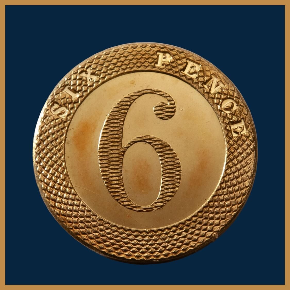 Reverse: A broad engine-turned rim encircles a large figure ‘6’ in the centre decoratively engraved and the words SIX PENCE incused in the rim.