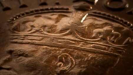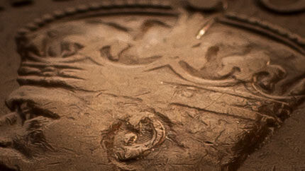 Notice the king’s eyebrow and ear: the high points that along with the crown sustain the first signs of wear during circulation.
