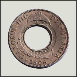 He secured the retention of the imported dollars by cutting out a circular disc from each coin. The holed dollar and the metal disc that fell out of the hole was over-stamped and transformed into a local, purely over valued coinage. The Holey Dollar and Dump.
