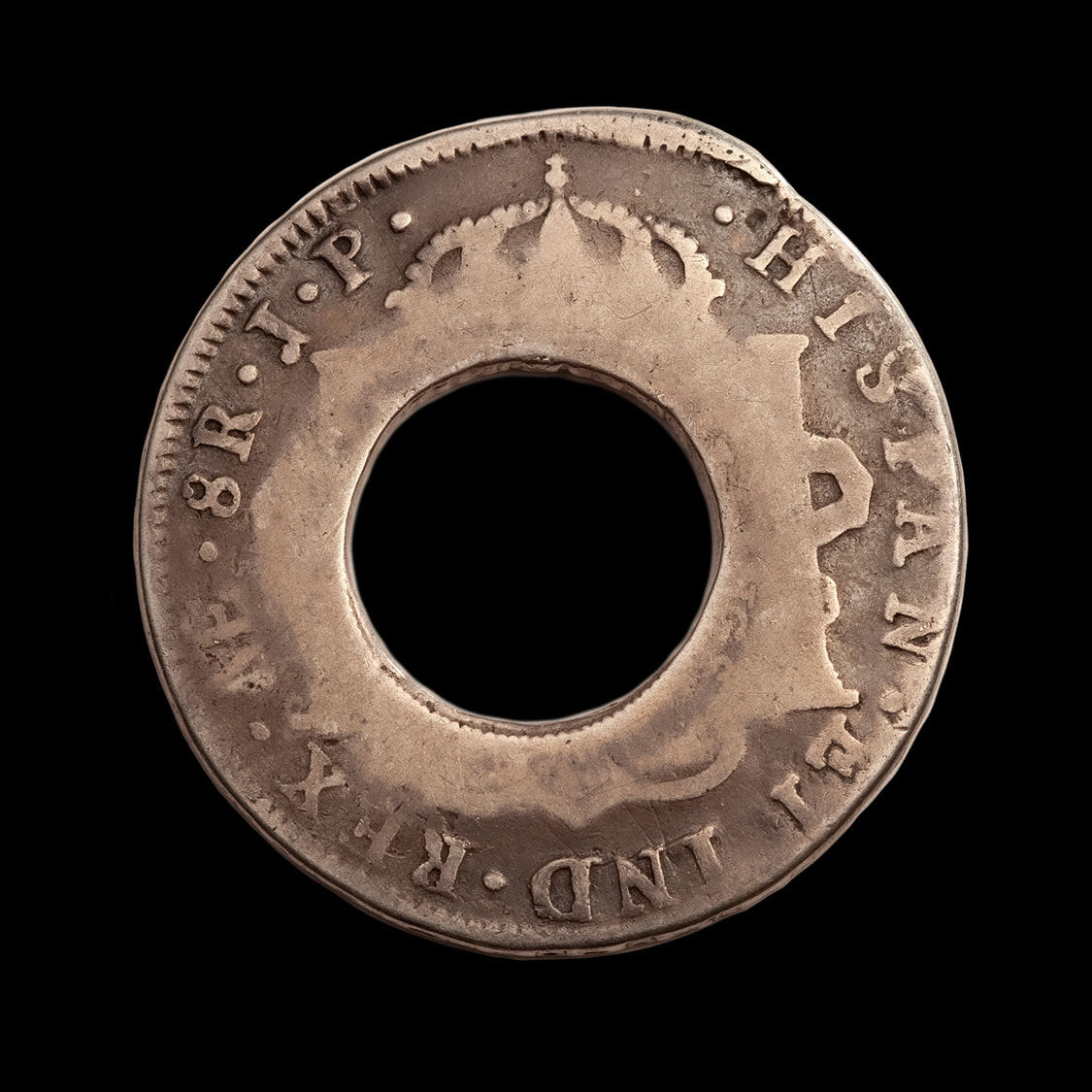 The Hannibal Head Holey Dollar was created from a Spanish Silver Dollar minted in 1810 and features an imaginary portrait of the monarch. William Henshall did an outstanding job in cutting out the hole from the Spanish Silver Dollar ... the monarch's eye is visible.