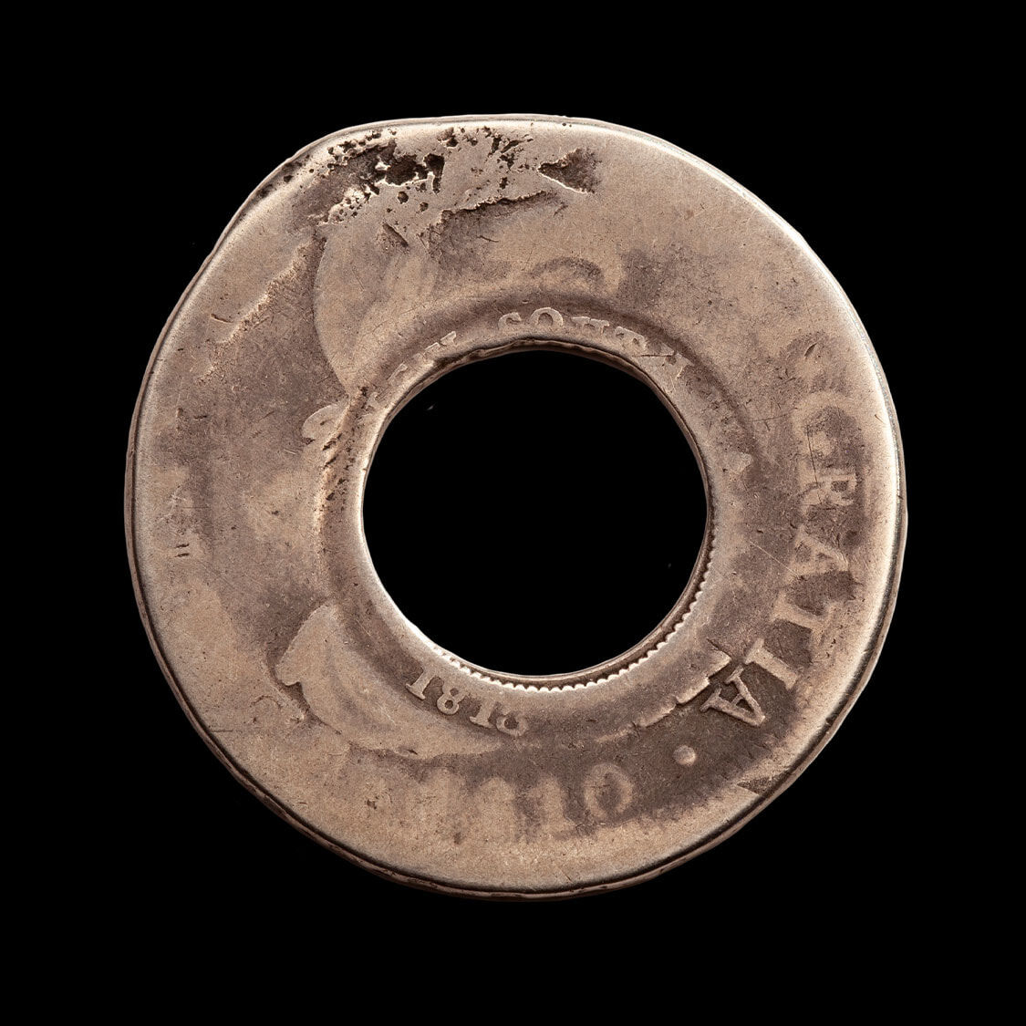 Concluding that the shipment of 40,000 Spanish Silver Dollars would not suffice, Macquarie decided to cut a hole in the centre of each dollar, thereby creating two coins out of one, a ring dollar and a disc. It was an extension of a practice of ‘cutting’ coins into segments, widespread at the time.