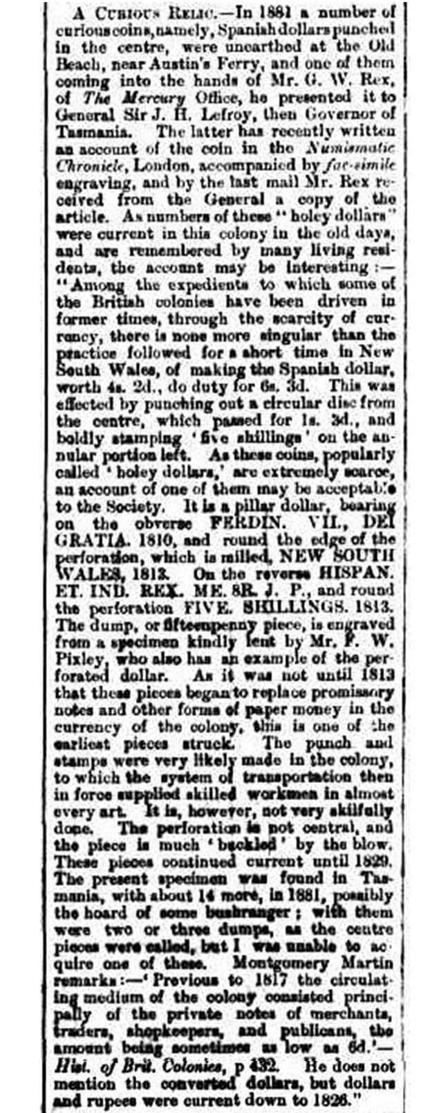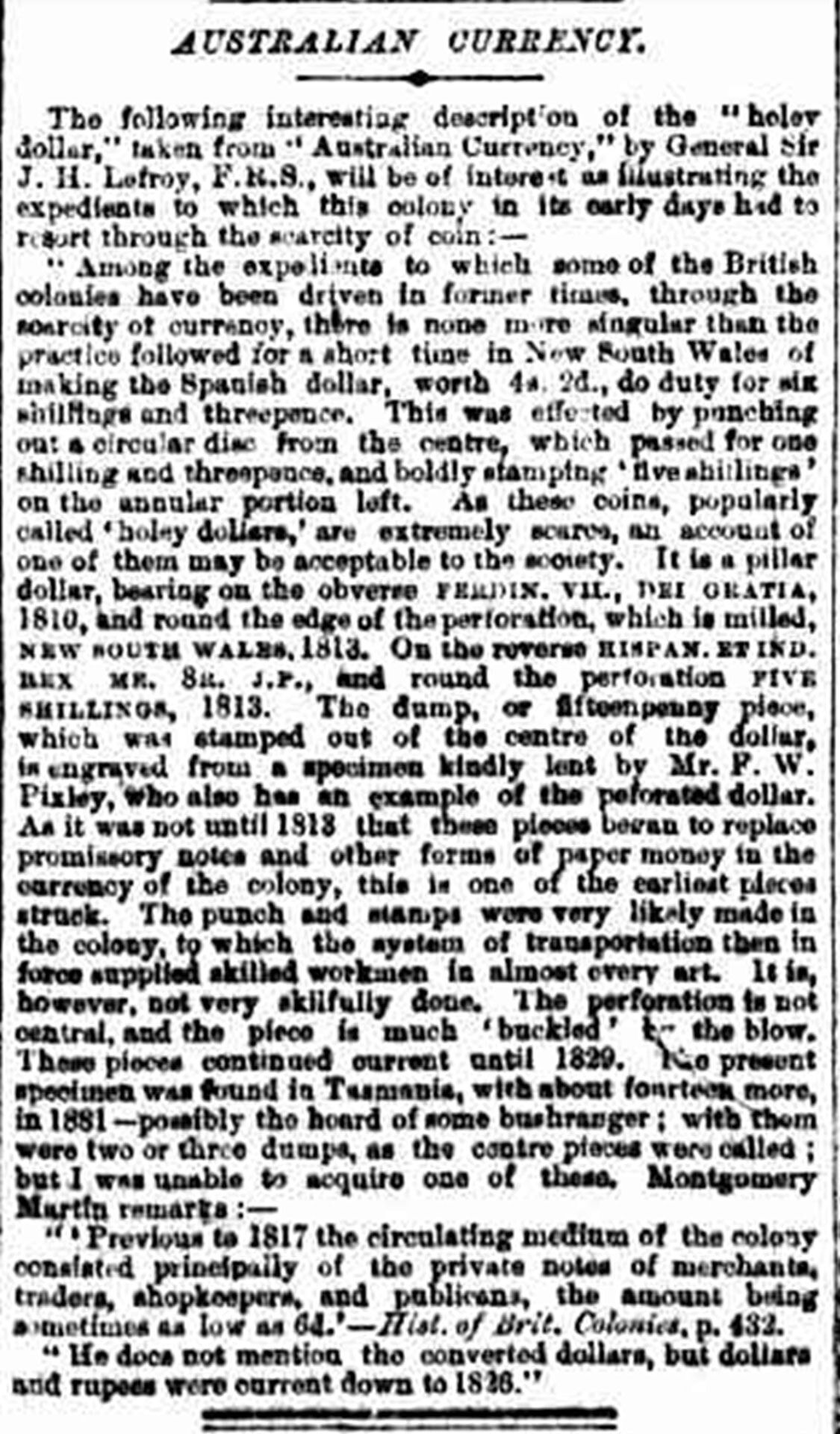 Forty thousand Spanish Silver Dollars were imported by Governor Lachlan Macquarie in 1812 from the East India Company, the coin to be converted into forty thousand Holey Dollars, the nation's first circulating currency.