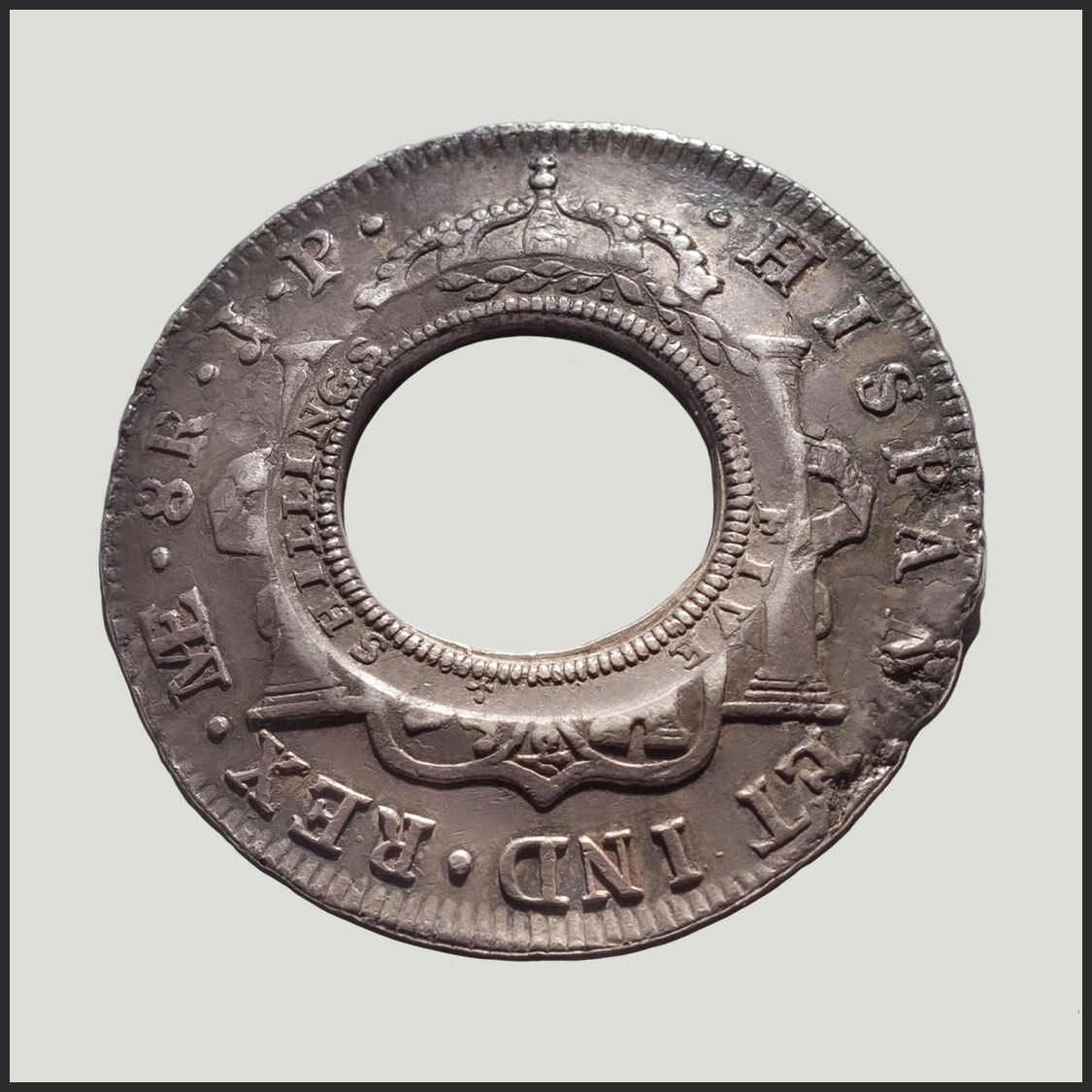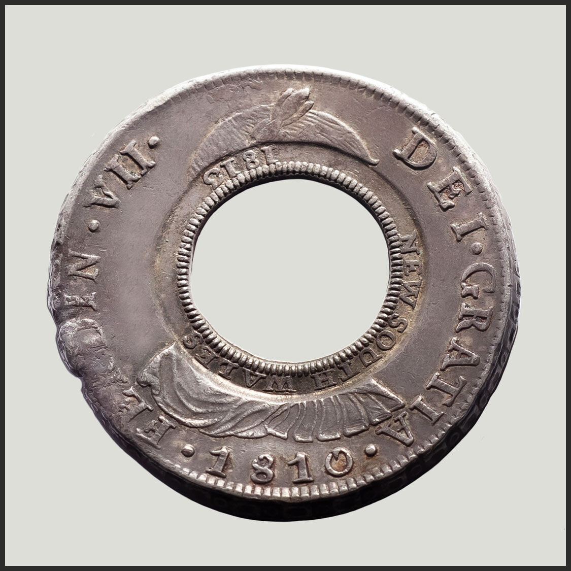 The Hannibal Head Holey Dollar was struck from a Spanish silver dollar minted in 1810 at the Lima Mint, Peru. And features the legend of Ferdinand VII and an imaginary portrait of the reigning monarch.