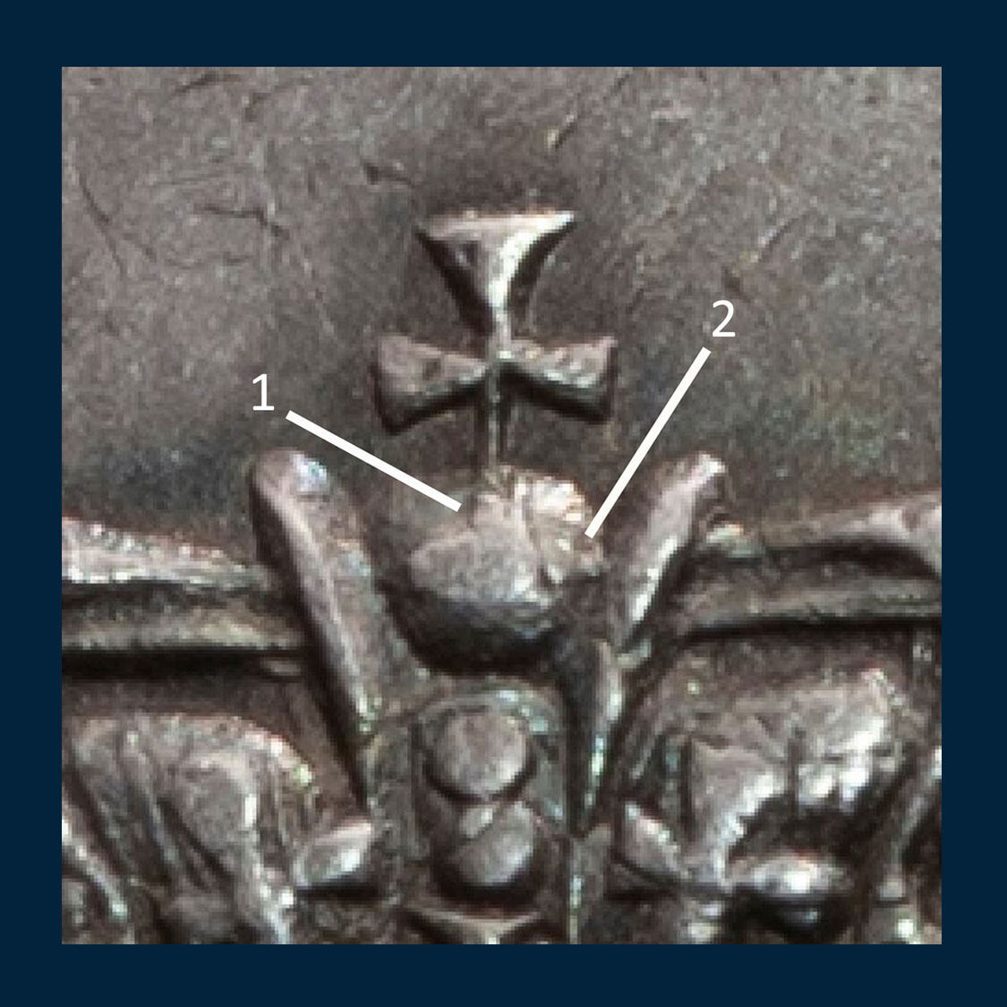 The snapshot below shows the vertical line (pointer 1) and the right-hand side of the horizontal line (pointer 2) that make up the cross on the orb on the crown. We have seen this level of detail in only one other example.