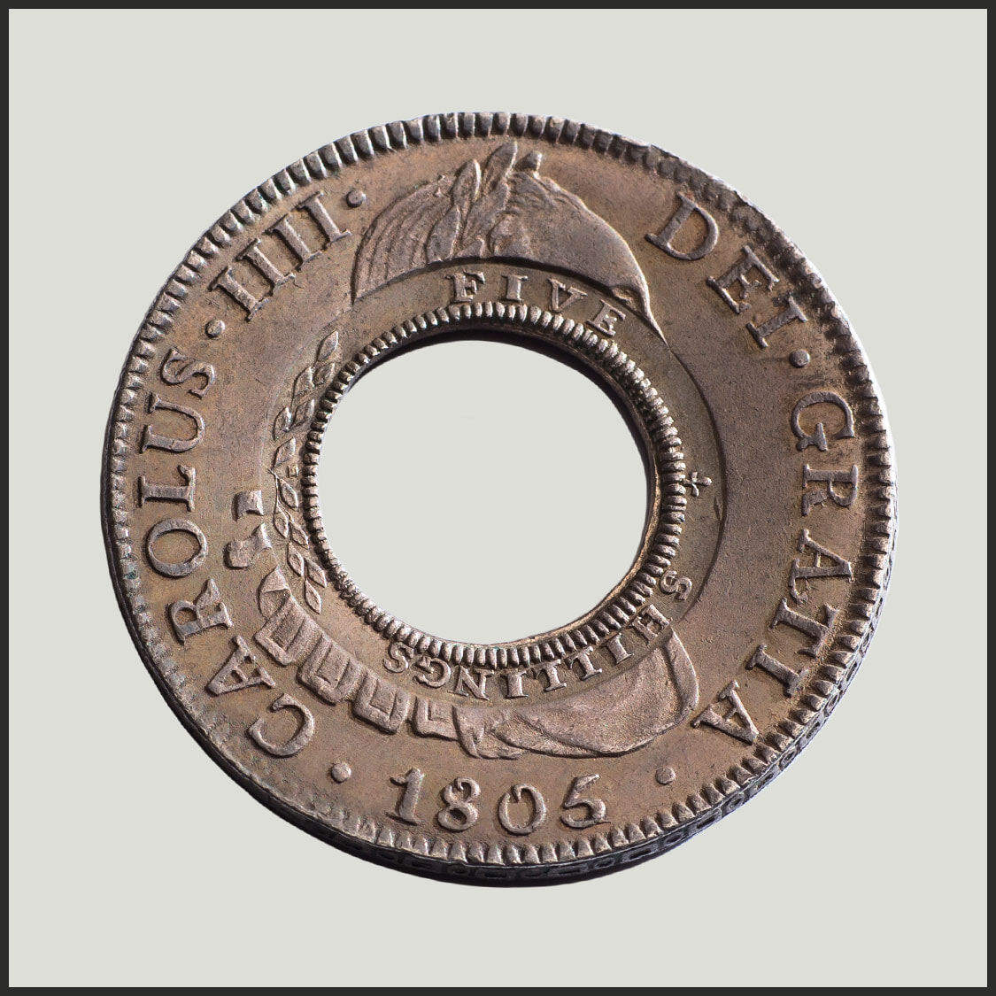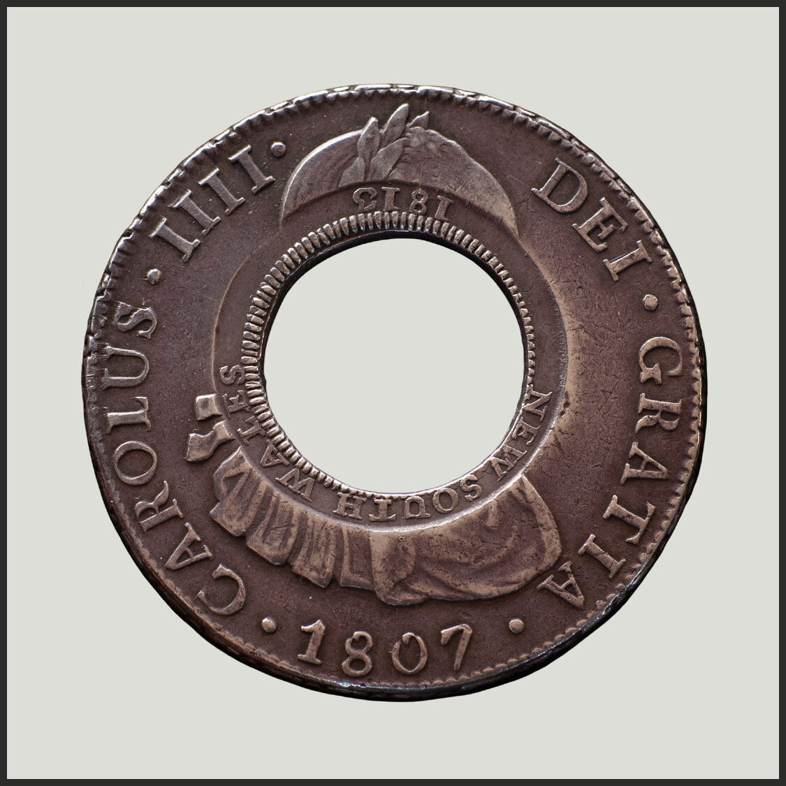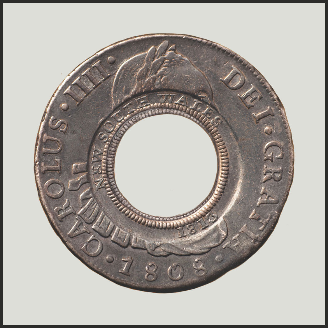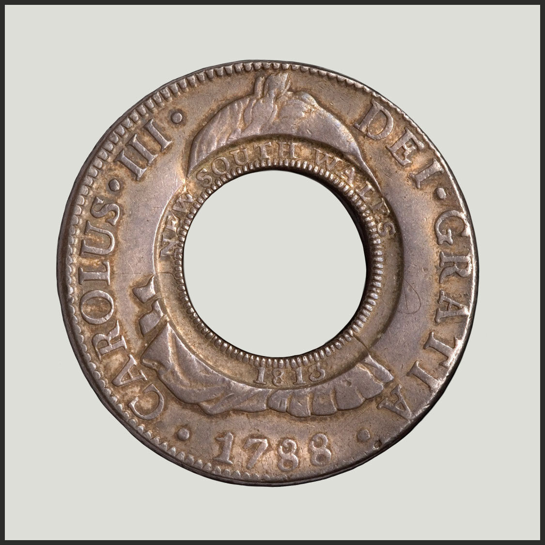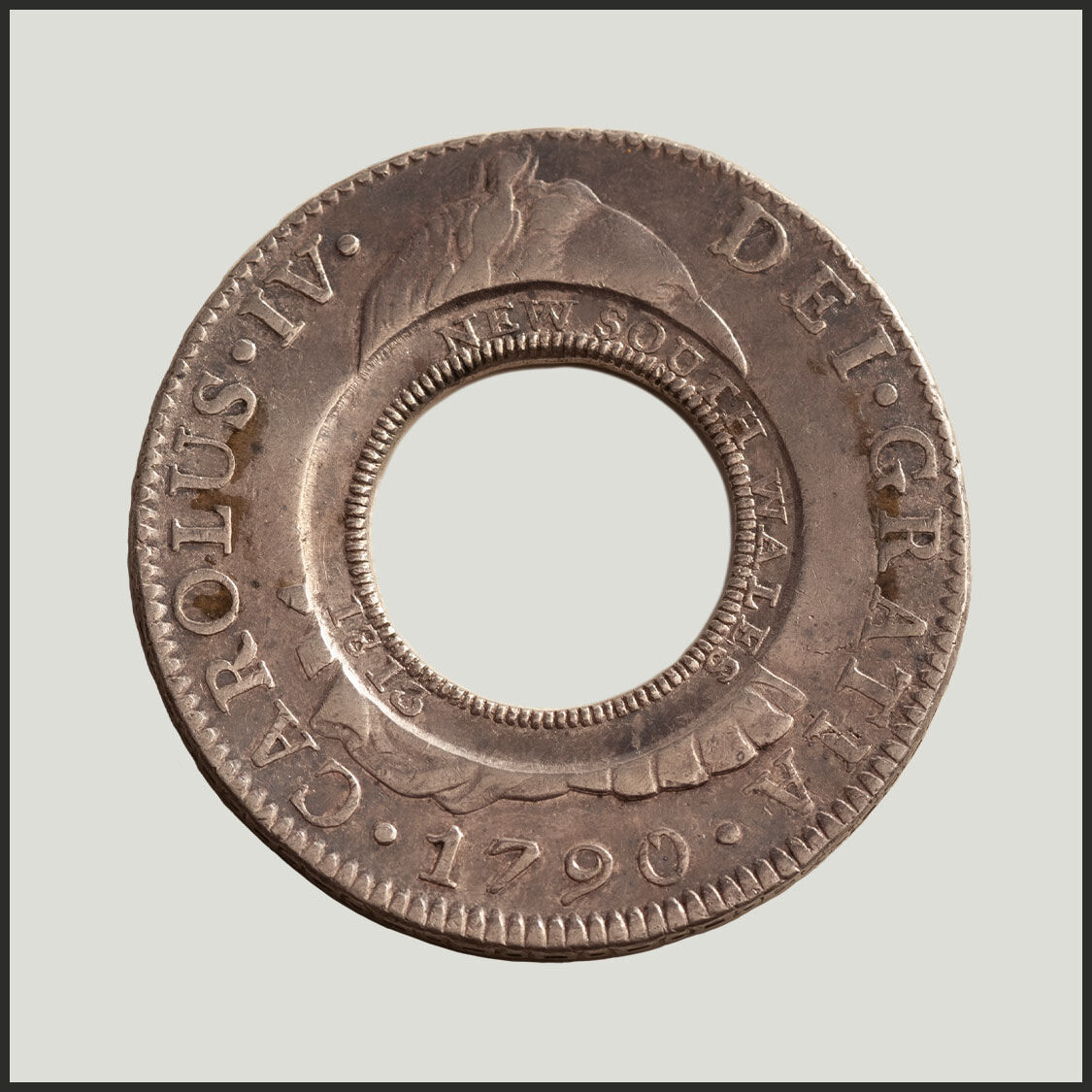 Created from a Spanish Silver Dollar of the 'bust' type depicting the portrait and legend of the deceased King Charles III (Charles III died in December 1788). To maintain coin production, the colonial mints continued to produce coinage with the legend and portrait of the deceased king. Three hundred Holey Dollars survive today and of those, only two have this extraordinary design detail.