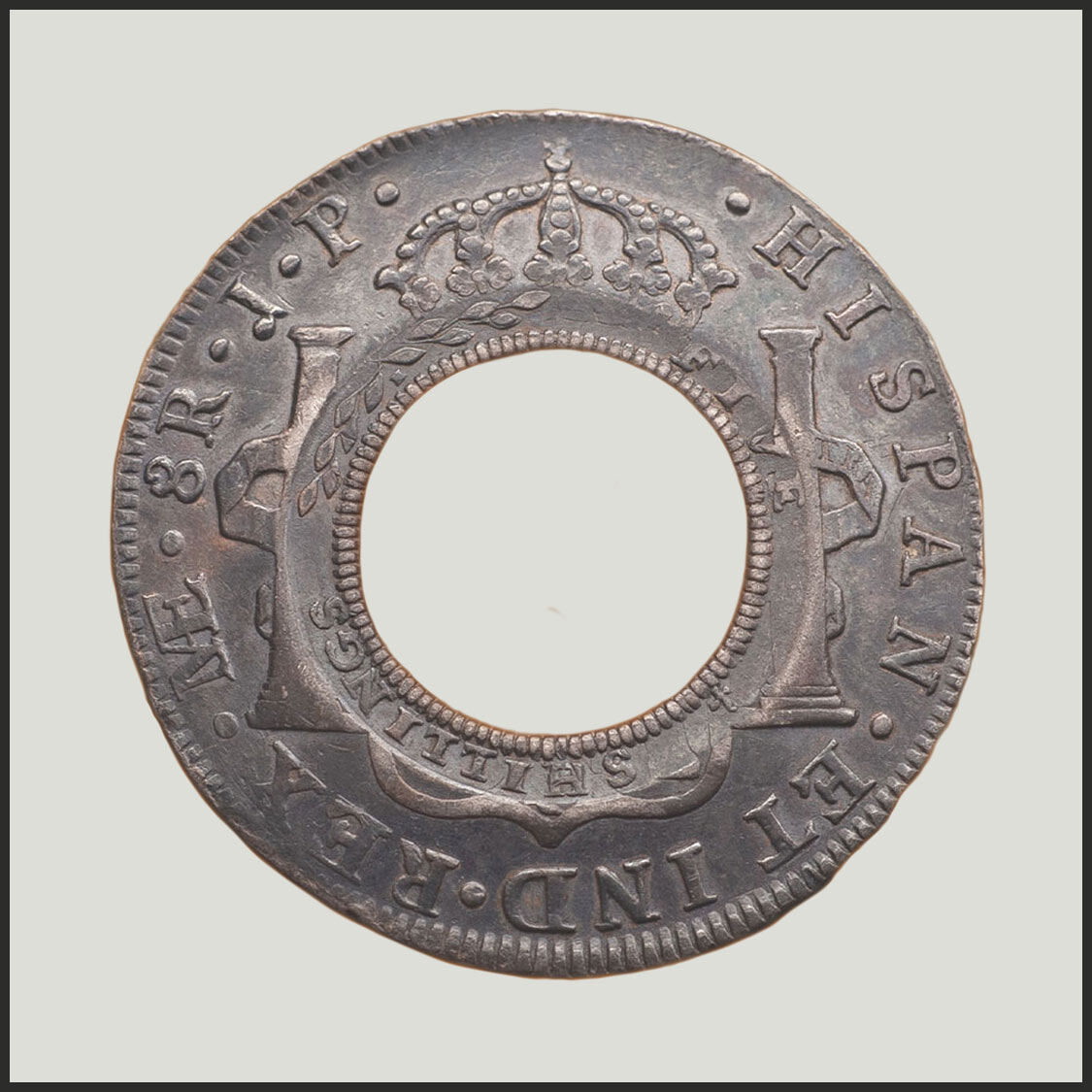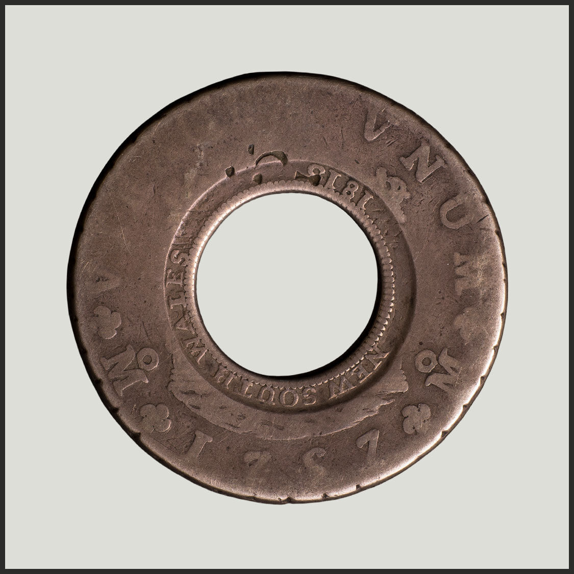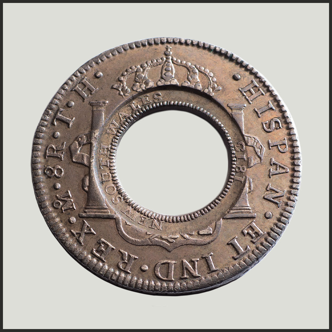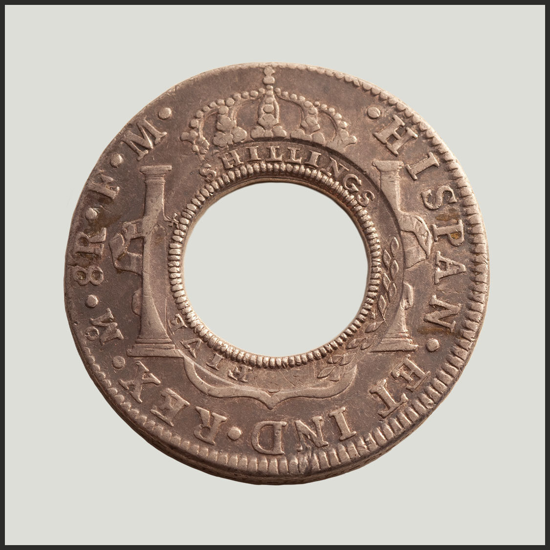 The Spanish Silver Dollar was the coin that 'ruled the world' in the eighteenth century, internationally traded. Most of the dollars imported by Macquarie were well used, their design details worn to the point of being partially obliterated.